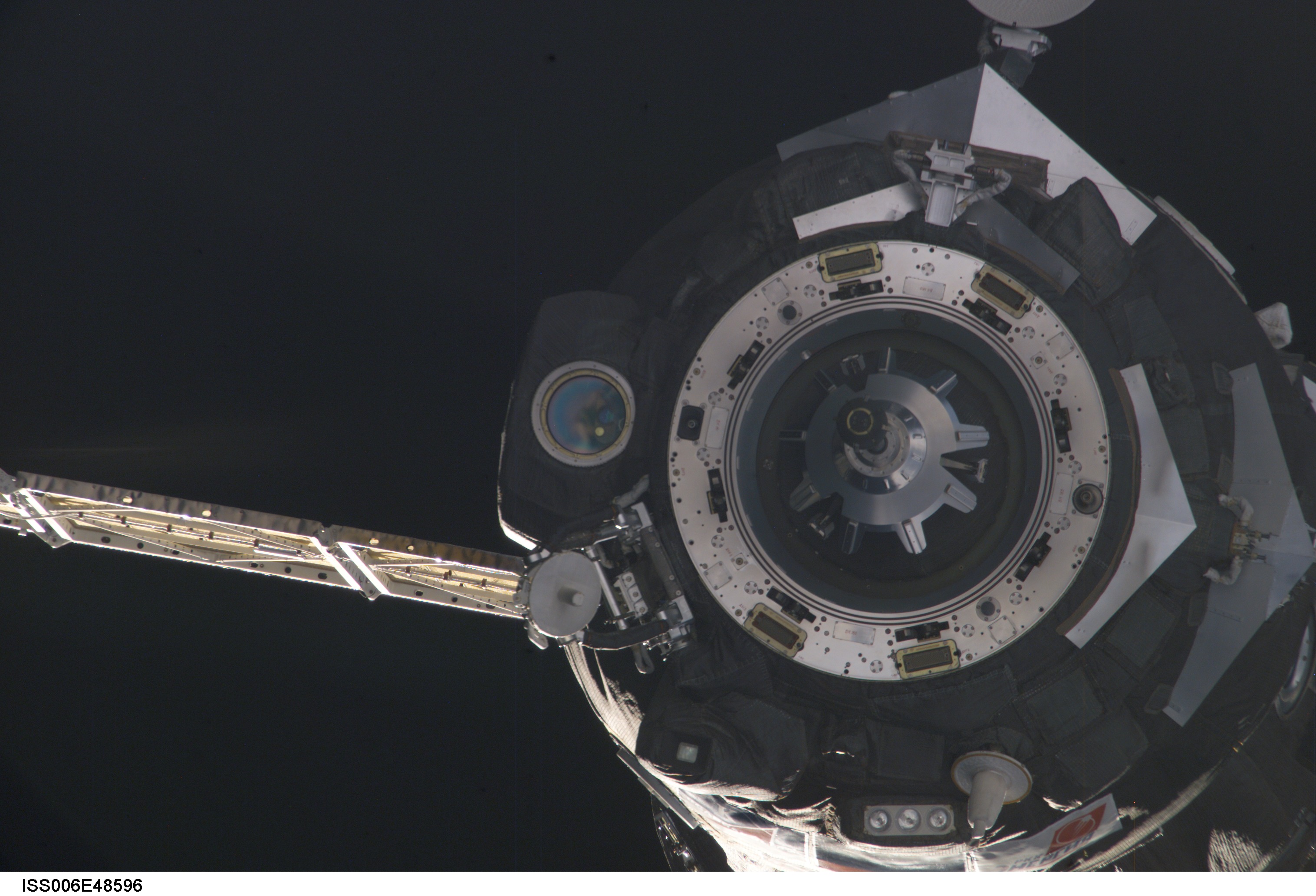 ISS006-E-48596 (28 April 2003) --- Backdropped against the blackness of space, the Soyuz TMA-2 spacecraft approaches the International Space Station (ISS). Onboard the spacecraft are the Expedition Seven crewmembers, cosmonaut Yuri I. Malenchenko, mission commander representing Rosaviakosmos, and astronaut Edward T. Lu, NASA ISS science officer and flight engineer. The Soyuz docked at the functional cargo block (FGB) nadir port at 12:56 a.m. (CDT) on April 28, 2003.