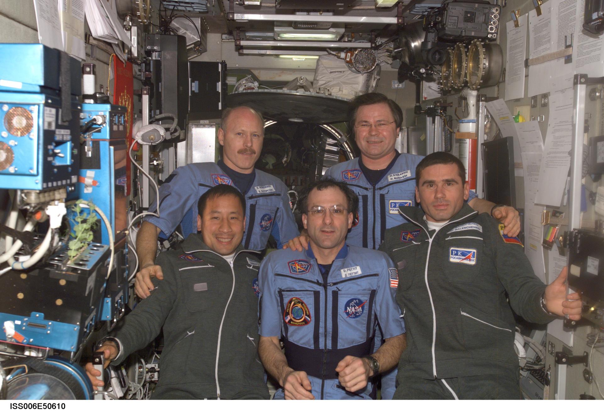 ISS006-E-50610 (28 April 2003) --- The Expedition Six and Seven crews pose for a group photo in the Zvezda Service Module on the International Space Station (ISS). From the left (front row) are astronauts Edward T. Lu, Expedition Seven NASA ISS science officer and flight engineer; Donald R. Pettit, Expedition Six NASA ISS science officer; and cosmonaut Yuri I. Malenchenko, Expedition Seven mission commander. From the left (back row) are astronaut Kenneth D. Bowersox, Expedition Six mission commander, and cosmonaut Nikolai M. Budarin, Expedition Six flight engineer. Budarin and Malenchenko represent Rosaviakosmos.