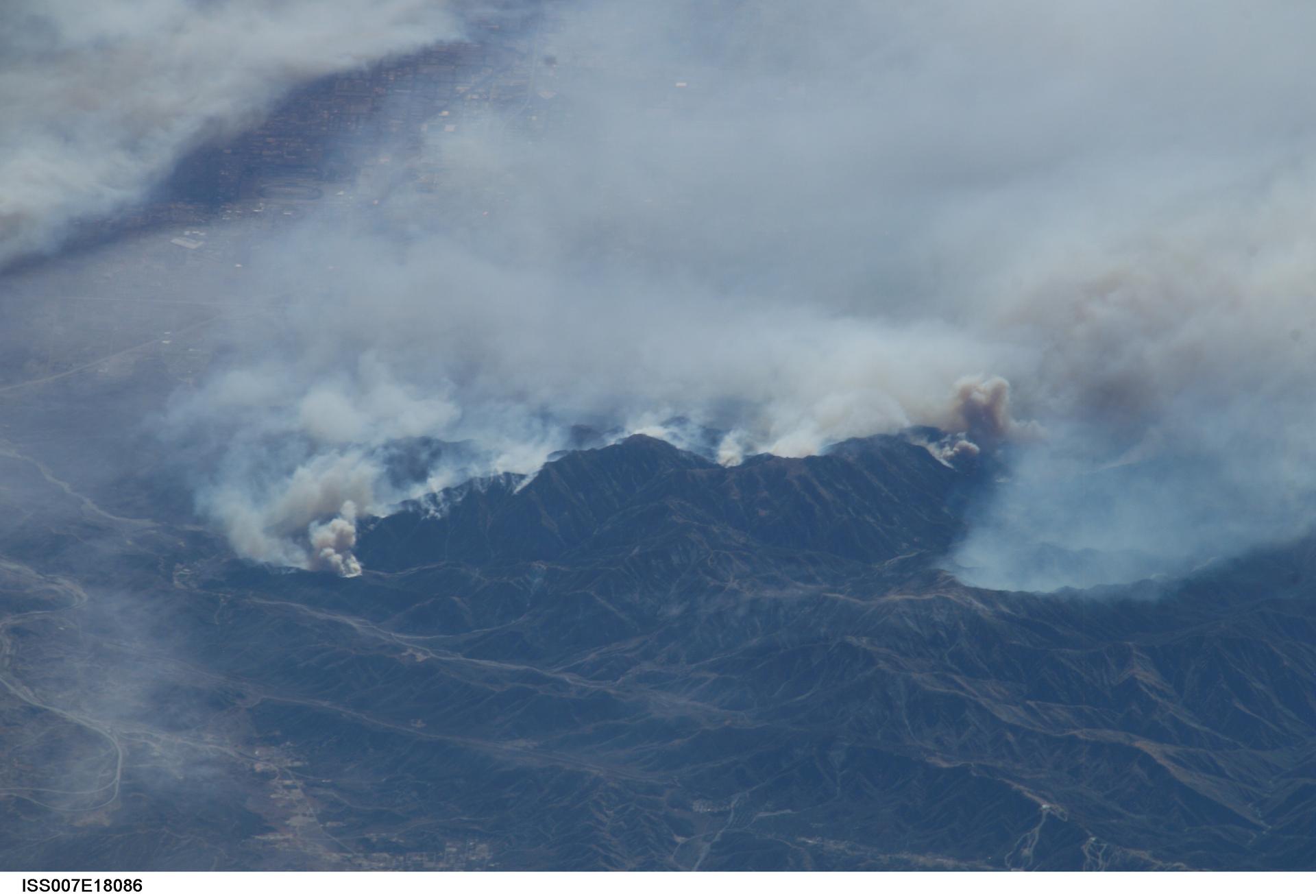 ISS007-E-18086 (26 October 2003) --- The fires in the San Bernardino Mountains, fueled by Santa Ana winds, burned out of control on the morning of Oct. 26, 2003, when this image and several others were taken from the International Space Station. This frame and image numbers 18087 and 18088 were taken at approximately 19:54 GMT, October 26, 2003 with a digital still camera equipped with a 400mm lens. Lake Arrowhead and Silverwood Lake are just out of frame. Content was provided by JSC’s Earth Observation Lab. The International Space Station Program {link to http://spaceflight.nasa.gov} supports the laboratory to help astronauts take pictures of Earth that will be of the greatest value to scientists and the public, and to make those images freely available on the Internet. Additional images taken by astronauts and cosmonauts can be viewed at the NASA/JSC Gateway to Astronaut Photography of Earth [link to http://eol.jsc.nasa.gov/].