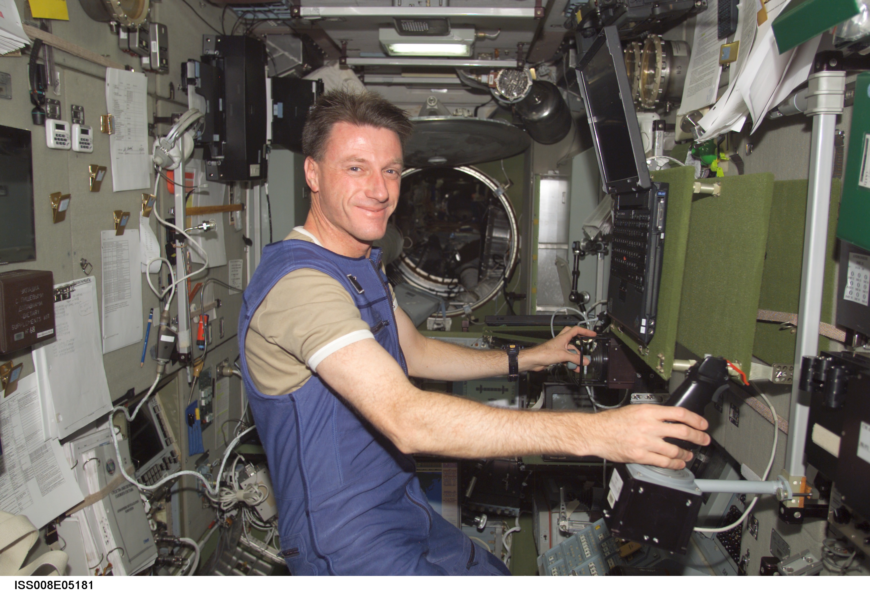 ISS008-E-05181 (31 October 2003) --- Astronaut C. Michael Foale, Expedition 8 mission commander and NASA ISS science officer, works with the Russian biomedical “Pilot” experiment (MBI-15) in the Zvezda Service Module on the International Space Station (ISS). The experiment, which looks at psychological and physiological changes in crew performance during long-duration spaceflight, requires a worktable, ankle restraint system and two control handles for testing piloting skill.