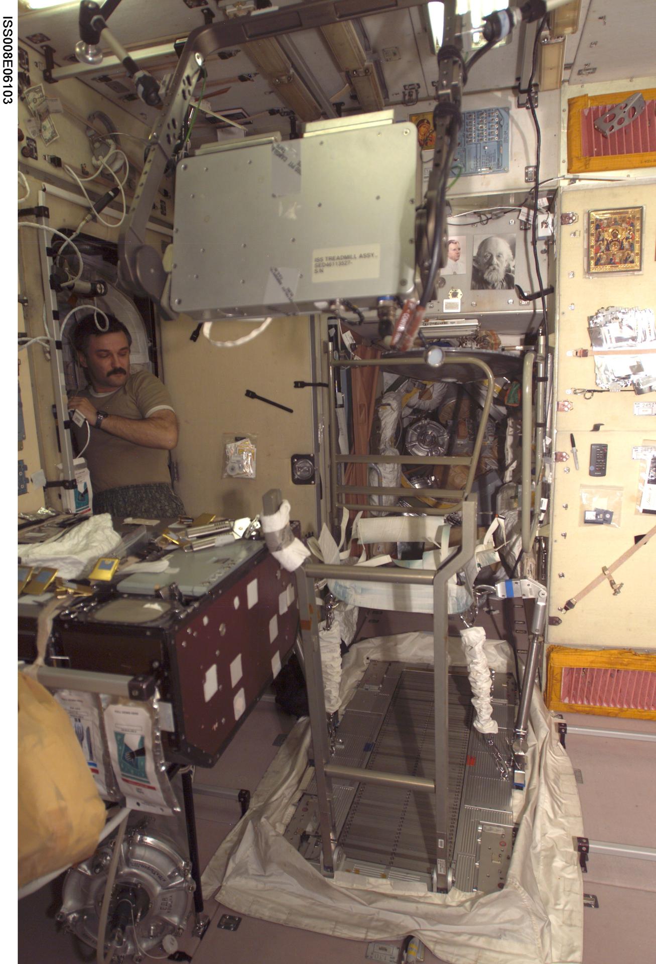 ISS008-E-06103 (23 November 2003) --- Cosmonaut Alexander Y. Kaleri, Expedition 8 flight engineer, performs in-flight maintenance (IFM) on the Treadmill Vibration Isolation System (TVIS) in the Zvezda Service Module on the International Space Station (ISS). Kaleri represents Rosaviakosmos.
