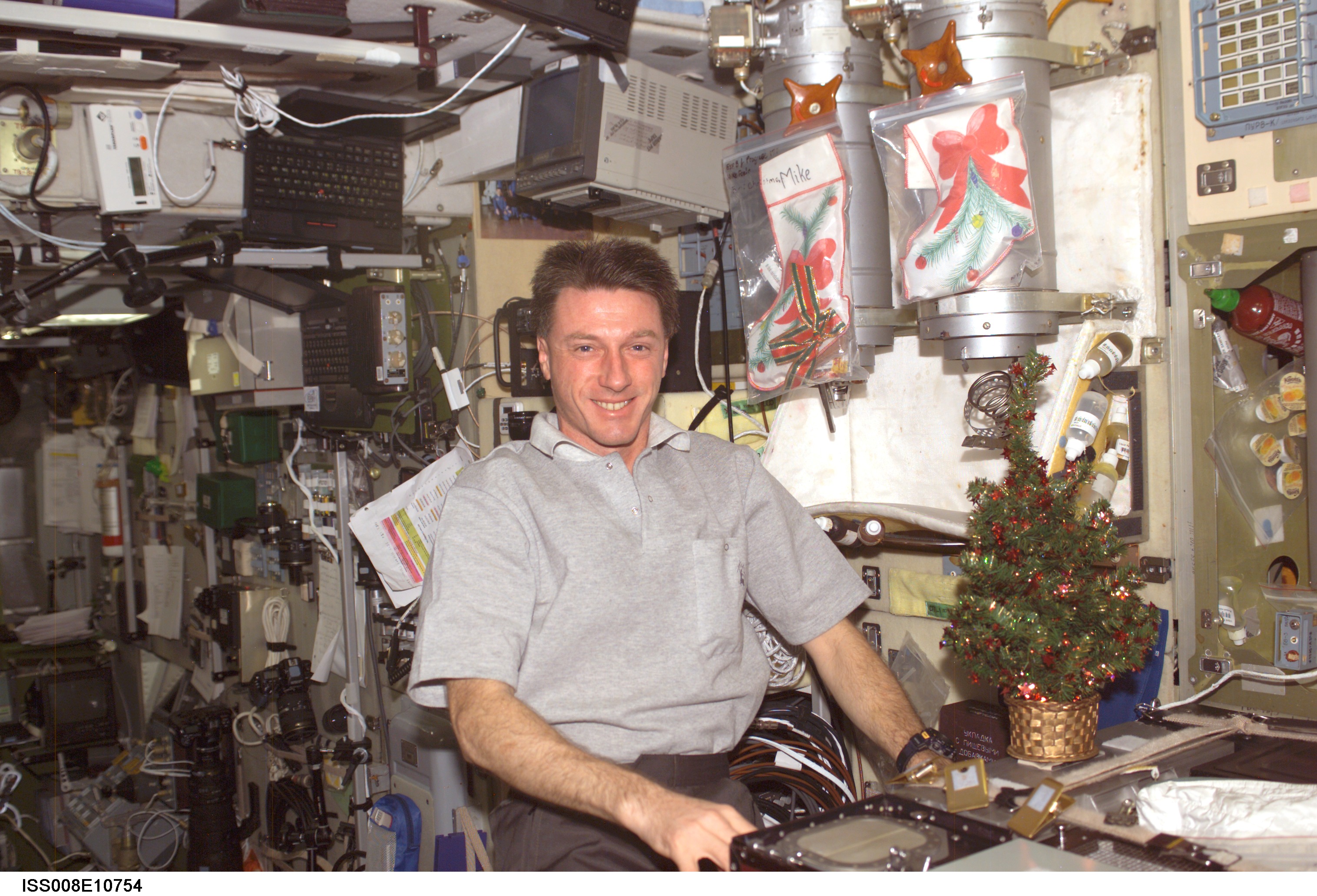 ISS008-E-10754 (28 December 2003) --- Astronaut C. Michael Foale, Expedition 8 mission commander and NASA ISS science officer, poses with holiday decorations in the Zvezda Service Module on the International Space Station (ISS).