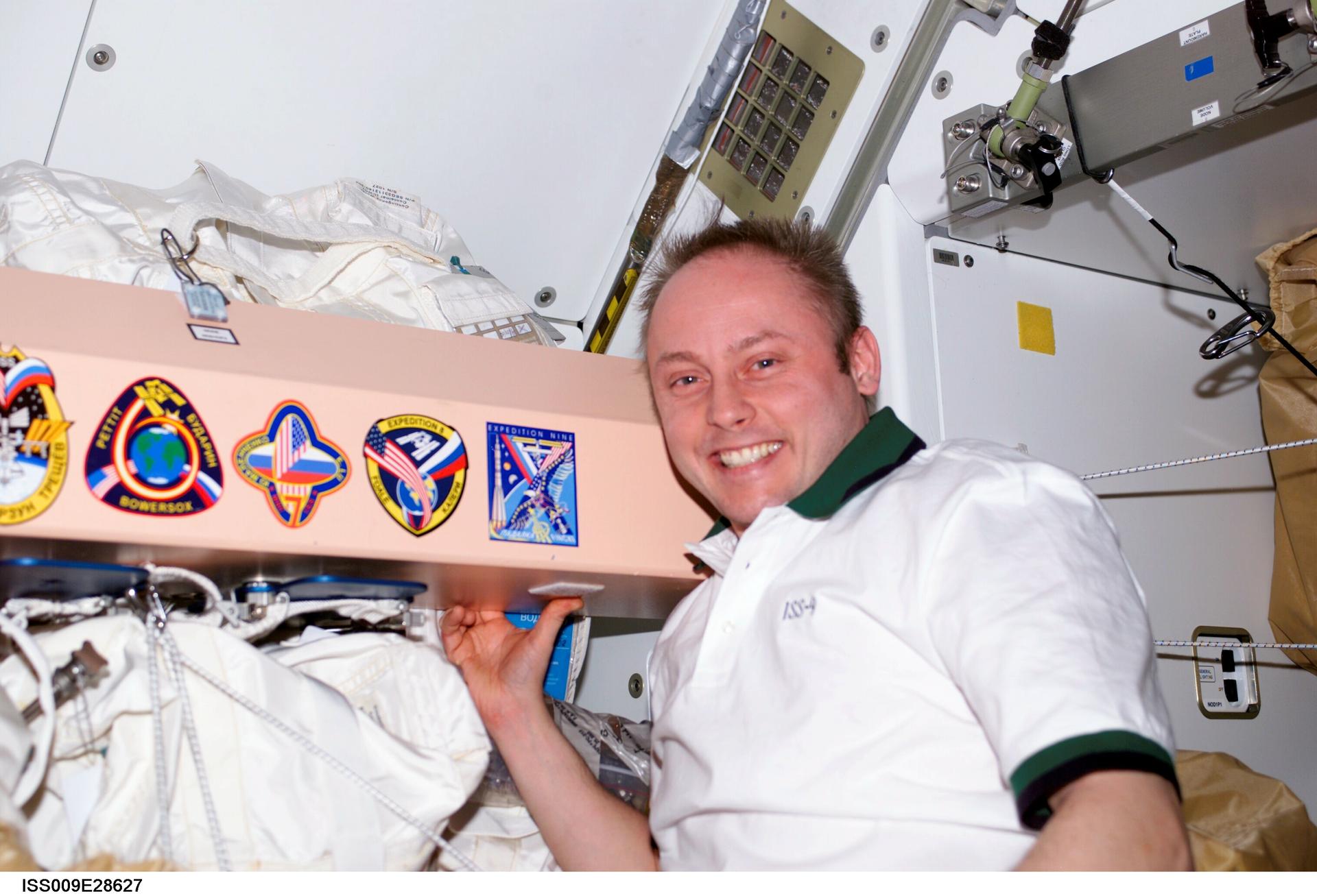 ISS009-E-28627 (1 July 2004) --- Astronaut Edward M. (Mike) Fincke, Expedition 9 NASA ISS science officer and flight engineer, poses by the Expedition mission insignias placed in the Unity node of the International Space Station (ISS).