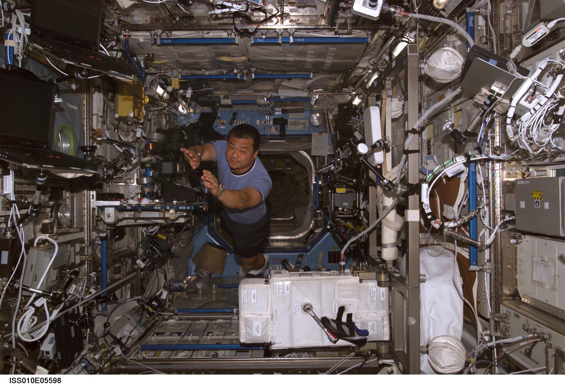 ISS010-E-05598 (31 October 2004) --- Astronaut Leroy Chiao, Expedition 10 commander and NASA ISS science officer, floats in the Destiny laboratory of the International Space Station (ISS).