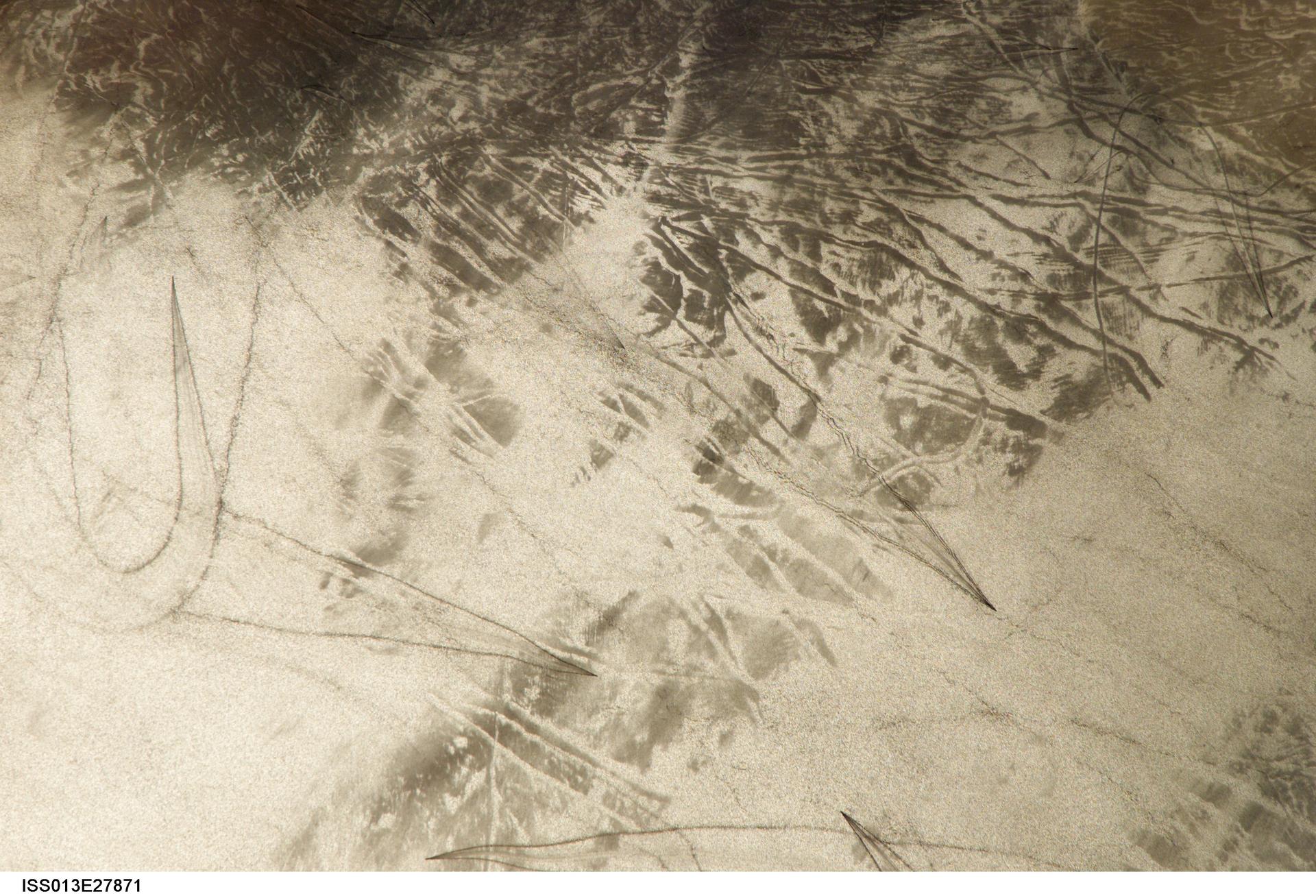 ISS013-E-27871 (28 May 2006) --- Considerable sunglint emphasizes features on Lake Erie in this image photographed by an Expedition 13 crewmember on the International Space Station. This detailed, south-looking image shows features on the surface of Lake Erie, about 30 miles west of Cleveland, Ohio. At left, a thin, V-shaped wake curves back towards the shore. This type of wake is typically created by a small, light craft such as a speedboat or sailboat under power.