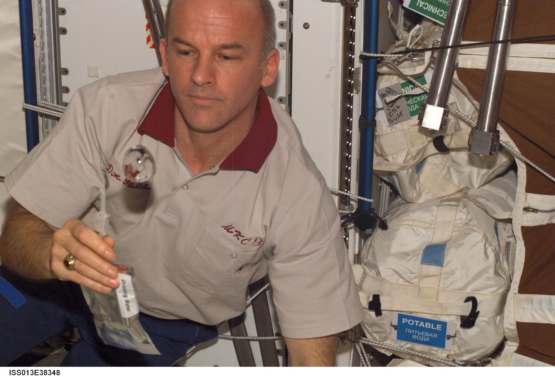 ISS013-E-38348 (18 June 2006) --- Astronaut Jeffrey N. Williams, Expedition 13 NASA space station science officer and flight engineer, watches a water bubble float freely while holding a container of water in the Destiny laboratory of the International Space Station.