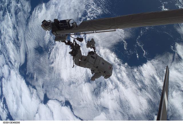 ISS013-E-49200 (8 July 2006) --- Anchored to the Space Shuttle Discovery's Remote Manipulator System/Orbiter Boom Sensor System (RMS/OBSS) foot restraint, astronaut Piers J. Sellers, STS-121 mission specialist, participates in the mission's first session of extravehicular activity (EVA) while the shuttle was docked with the International Space Station. Discovery's vertical stabilizer is at right. A cloud-covered Earth provides the backdrop for the scene.