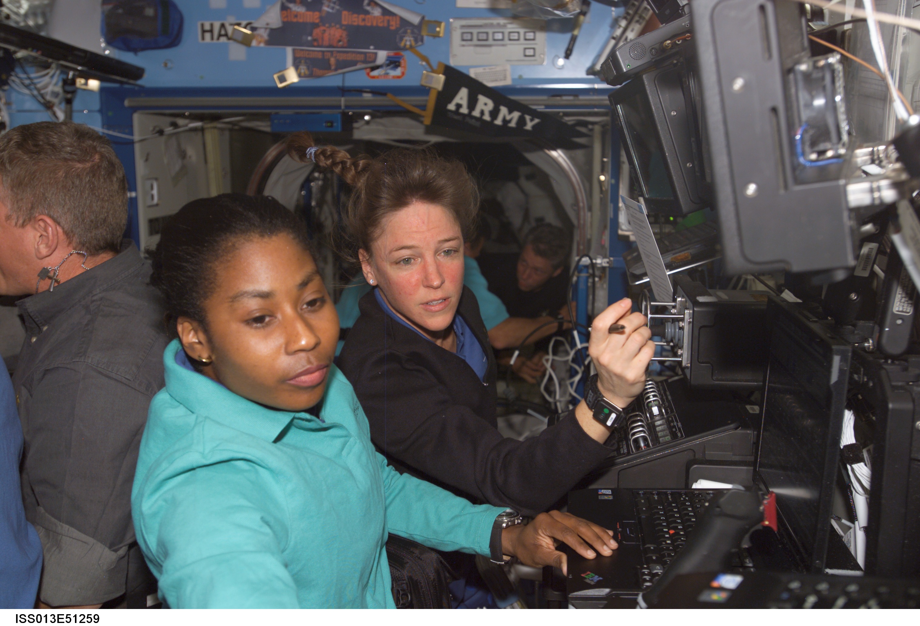 ISS013-E-51259 (14 July 2006) --- Astronauts Stephanie D. Wilson (foreground) and Lisa M. Nowak, STS-121 mission specialists, work with the Mobile Service System (MSS) and Canadarm2 controls in the Destiny laboratory of the International Space Station while Space Shuttle Discovery was docked to the station. Using the station's arm, Wilson and Nowak joined forces to re-stow the Italian-built Leonardo Multi-Purpose Logistics Module (MPLM) in the payload bay of the shuttle.