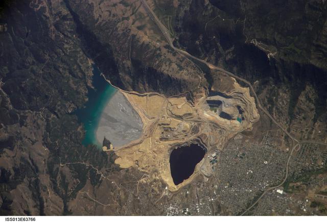 ISS013-E-63766 (2 Aug. 2006) --- Berkeley Pit and Butte, Montana are featured in this image photographed by an Expedition 13 crewmember on the International Space Station. The city of Butte, Montana has long been a center of mining activity. Underground mining of copper began in Butte in the 1870s, and by 1901 underground workings had extended to the groundwater table. Thus began the creation of an intricate complex of underground drains and pumps to lower the groundwater level and continue the extraction of copper. Water extracted from the mines was so rich in dissolved copper sulfate that it was also "mined" (by chemical precipitation) for the copper it contained. In 1955, the Anaconda Copper Mining Company began open-pit mining for copper in what is now know as the Berkeley Pit (dark oblong area in center). The mine took advantage of the existing subterranean drainage and pump network to lower groundwater until 1982, when the new owner ARCO suspended operations at the mine. The groundwater level swiftly rose, and today water in the Pit is more than 900 feet deep. Many features of the mine workings are visible in this image such as the many terraced levels and access roadways of the open mine pits (gray and tan sculptured surfaces). A large gray tailings pile of waste rock and an adjacent tailings pond are visible to the north of the Berkeley Pit. Color changes in the tailings pond are due primarily to changing water depth. The Berkeley Pit is listed as a federal Superfund site due to its highly acidic water, which contains high concentrations of metals such as copper and zinc. The Berkeley Pit receives groundwater flowing through the surrounding bedrock and acts as a "terminal pit" or sink for these heavy metal-laden waters. Ongoing efforts include regulation of water flow into the pit to reduce filling of the Pit and potential release of contaminated water into local aquifers or surface streams.