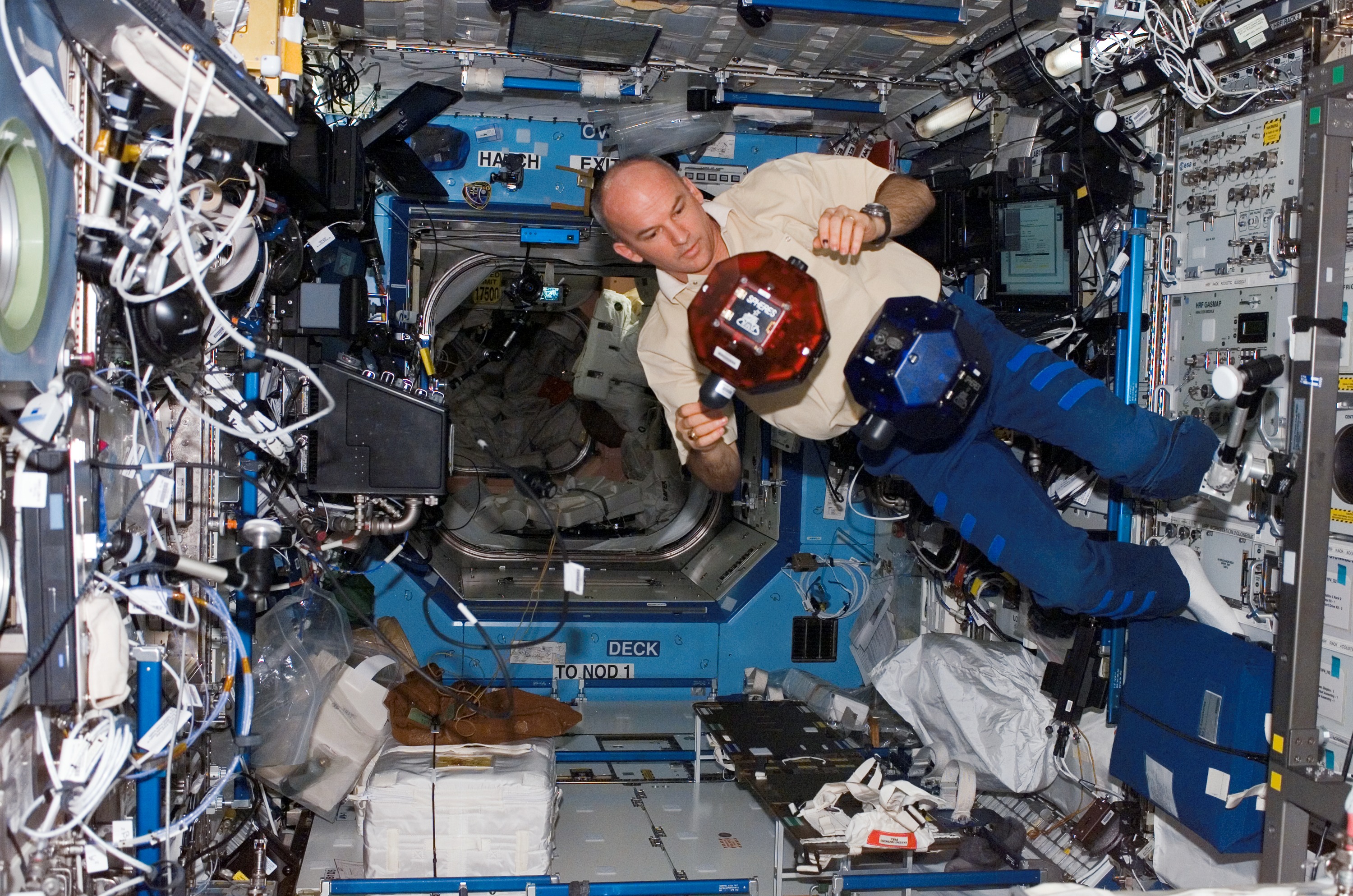 ISS013-E-68303 (19 Aug. 2006) --- Astronaut Jeffrey N. Williams, Expedition 13 NASA space station science officer and flight engineer, does a check of the Synchronized Position Hold, Engage, Reorient, Experimental Satellites (SPHERES) Beacon / Beacon Tester in the Destiny laboratory of the International Space Station.