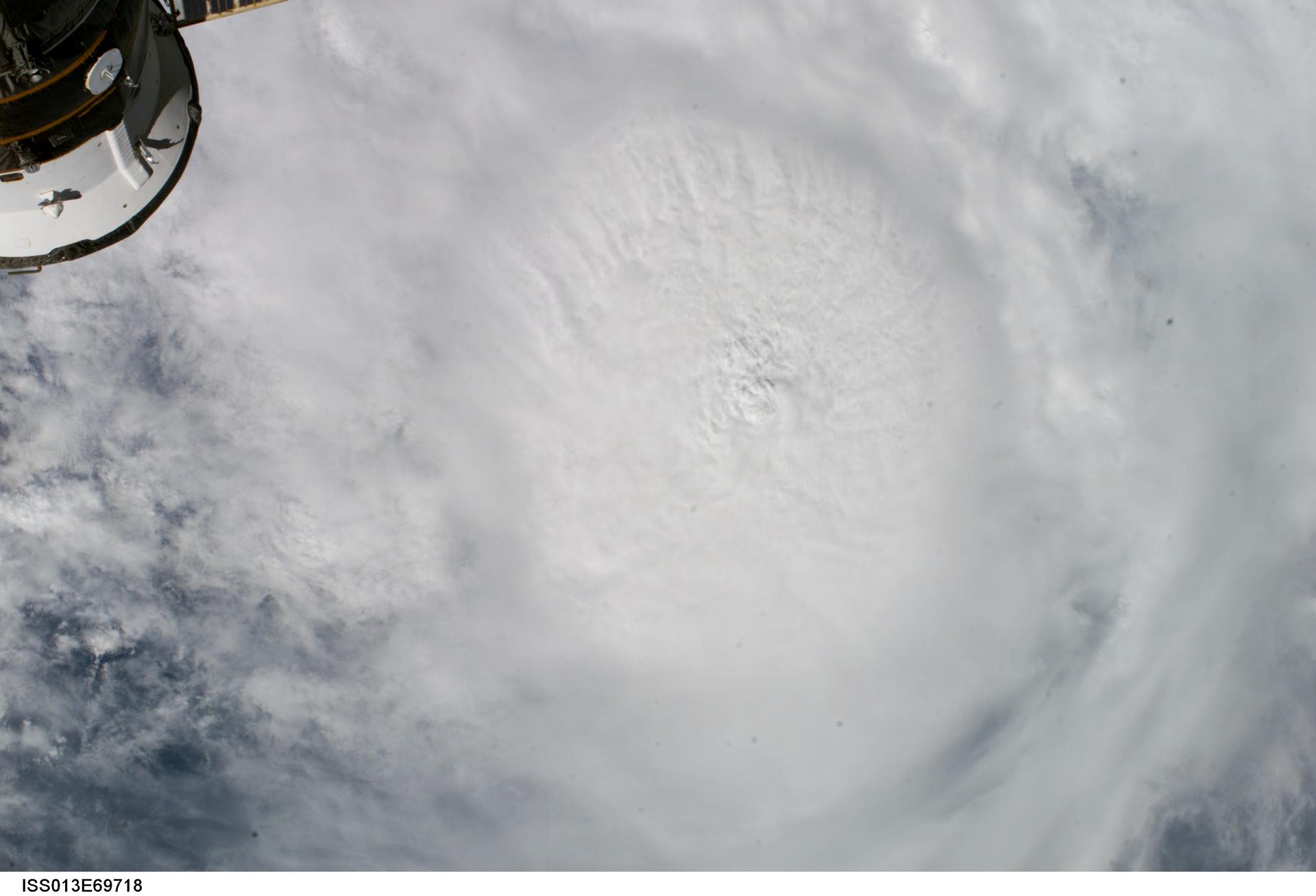 ISS013-E-69718 (27 August 2006) --- This vertical view of Hurricane Ernesto was taken by the crew of the International Space Station on Sunday, Aug. 27, 2006, from an altitude of about 215 miles. At that time, Ernesto was approaching Cuba and was expected to eventually make landfall on the coast of southern Florida. Part of a Russian spacecraft, docked to the orbital outpost, is visible in upper left corner.