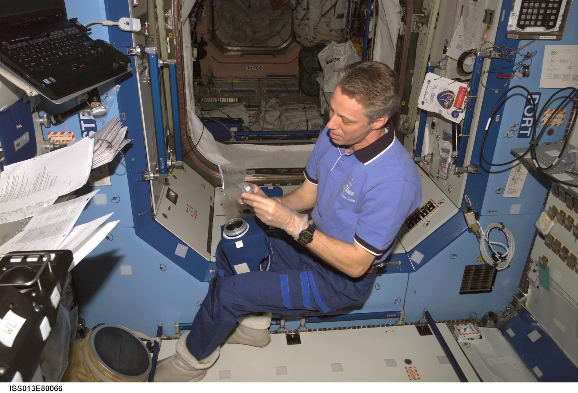 ISS013-E-80066 (10 Sept. 2006) --- European Space Agency (ESA) astronaut Thomas Reiter, Expedition 13 flight engineer, works with the surface, water and air biocharacterization (SWAB) air sampling device (ASD) filter kit in the Destiny laboratory of the International Space Station.