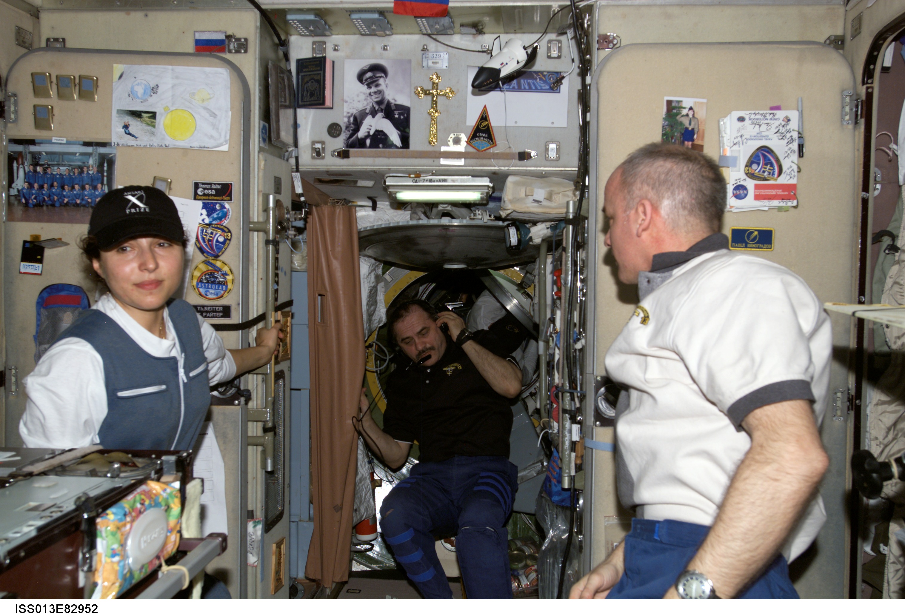 ISS013-E-82952 (20 Sept. 2006) --- Spaceflight participant Anousheh Ansari (left); cosmonaut Pavel V. Vinogradov, Expedition 13 commander representing Russia's Federal Space Agency; and astronaut Jeffrey N. Williams, NASA space station science officer and flight engineer, photographed in the Zvezda Service Module of the International Space Station.