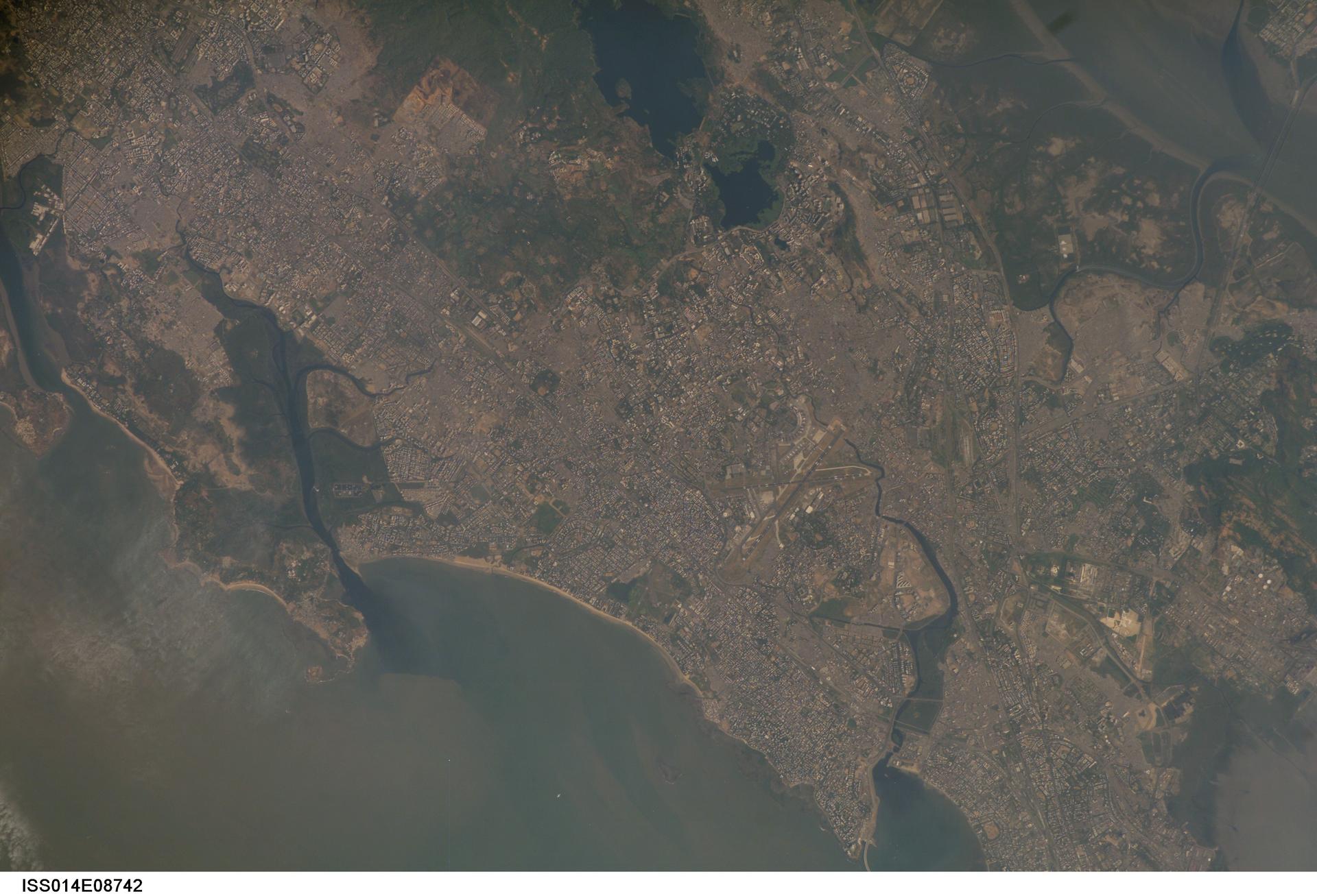 ISS014-E-08742 (28 Nov. 2006) --- Mumbai, India is featured in this image photographed by an Expedition 14 crewmember on the International Space Station. This view is one of three (frames 8741, 8742 and 8744) acquired within ten seconds of each other as the station passed over India. Mumbai (formerly known as Bombay) is a so-called mega city, with over 21 million people living in the greater Mumbai metropolitan region. Mega cities like Tokyo, New York, Sao Paulo, and Mumbai are also known as conurbations -- large contiguous areas of urban land cover formed from the growth and merging together of previously separate and distinct urban centers. The Mumbai conurbation includes several municipal entities including Bhiwandi, Kalyan, Thane, and Ulhasnagar. Located along the coast of western India on Salsette Island, Mumbai is generally considered to be the most modern of India's cities and is a major economic, transportation, and cultural center. Almost cloud-free conditions reveal the continuous urban land cover of the mega city extending north to south across Salsette Island -- a distance of nearly 50 kilometers. Sanjay Gandhi National Park (partially out of frame), bordered on three sides by the urbanized area, is the largest national park in the world located within city limits. In addition to providing a refuge for native flora and fauna, the park also includes two lakes that form part of the Mumbai drinking water system.