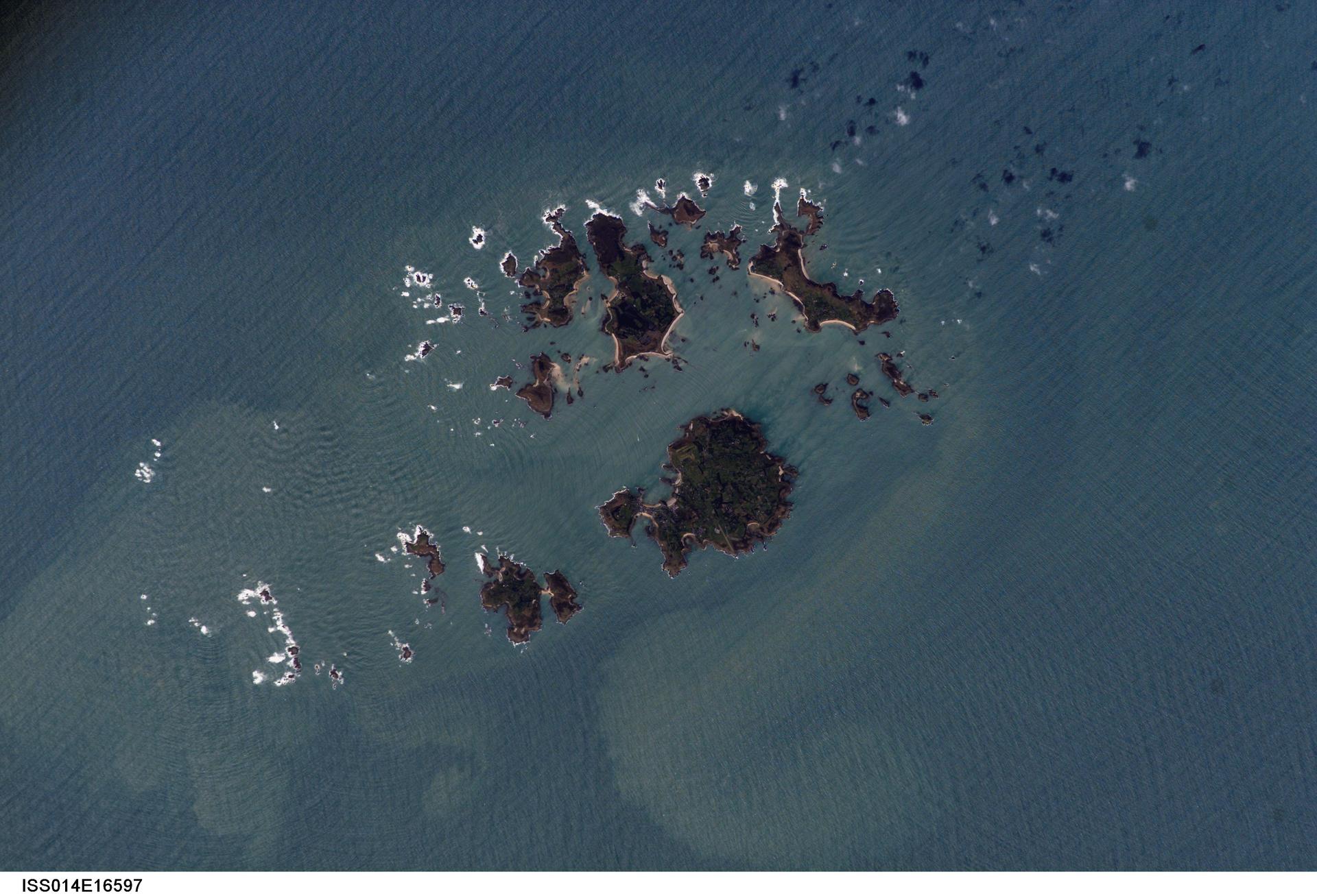 ISS014-E-16597 (10 March 2007) --- Isles of Scilly, United Kingdom is featured in this image photographed by an Expedition 14 crewmember on the International Space Station. The Isles of Scilly, an archipelago of approximately 150 islands, is located some 44 kilometers southwest of the westernmost point of England (Land's End). According to scientists, the islands are an erosional remnant of an ancient granite intrusion, and are notable because they have been inhabited for over 4000 years. Historical and geological evidence cited by NASA scientists on the Isles indicates that many of the islands were larger and/or connected in the recent past--this could be due to local subsidence, rising sea levels, or a combination of both factors. Even today, it is possible to walk between certain islands during low tides. The Isles have been designated a United Kingdom Area of Outstanding Natural Beauty due to their unique landscape, ecology, and historical significance. The potential effect of rising sea level on the Isles is a primary concern for both long-term ecosystem health and human habitability. This image illustrates the geographic configuration of the archipelago, and its effect on ocean wave patterns. Long linear swells oriented northeast-southwest and moving to the southeast (from upper left to lower right) are diffracted (bent) as they approach the coastlines and small shoals of the Isles. The wave diffraction forms complex interacting surface patterns--this is most clearly visible southwest of St. Mary's island (left). The dominant ocean wave pattern resumes to the southeast of St. Mary's, but with an additional northwest-southeast oriented pattern superimposed, possibly due to winds originating in the English channel to the east (not shown). Suspended, tan-colored sediments visible within and around the archipelago are locally derived from continuing wave erosion of the granite forming the islands and remobilization of beach sands. Bright white areas in the photograph are waves breaking on shoals.