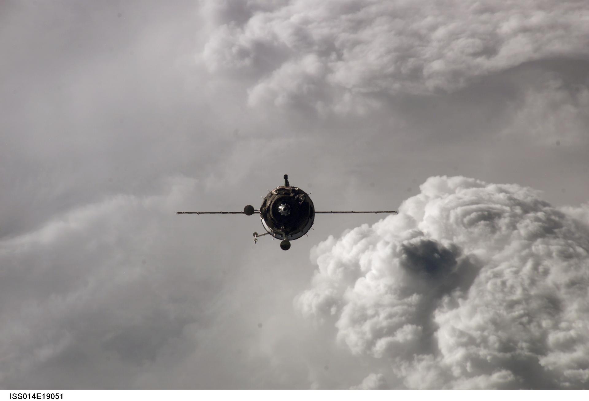ISS014-E-19051 (9 April 2007) --- Backdropped by a cloud-covered Earth, the Soyuz 14 (TMA-10) spacecraft approaches the International Space Station. Onboard the spacecraft are cosmonauts Fyodor N. Yurchikhin, Expedition 15 commander; and Oleg V. Kotov, Soyuz commander and flight engineer, both representing Russia's Federal Space Agency; along with spaceflight participant Charles Simonyi. With Kotov at the controls, the Soyuz linked up to the Zarya module nadir port at 2:10 p.m. (CDT) on April 9, 2007. The docking followed Saturday's launch from Baikonur Cosmodrome in Kazakhstan.