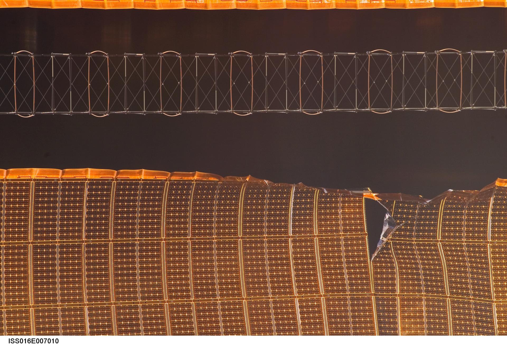 ISS016-E-007010 (30 Oct. 2007) --- A view of a damaged P6 4B solar array wing on the International Space Station. NASA halted the deployment -- which is about 80 percent complete -- to evaluate the damage.