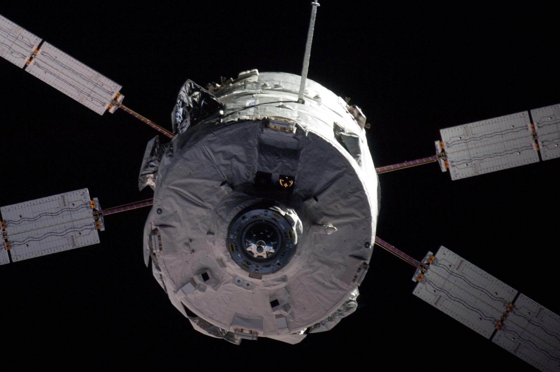 ISS016-E-034176 (31 March 2008) --- Backdropped by the blackness of space, the Jules Verne Automated Transfer Vehicle (ATV) approaches the International Space Station on Monday, March 31, 2008, for its "Demo Day 2" practice maneuvers. It moved to within 36 feet of the Zvezda Service Module in a rehearsal for docking on Thursday.
