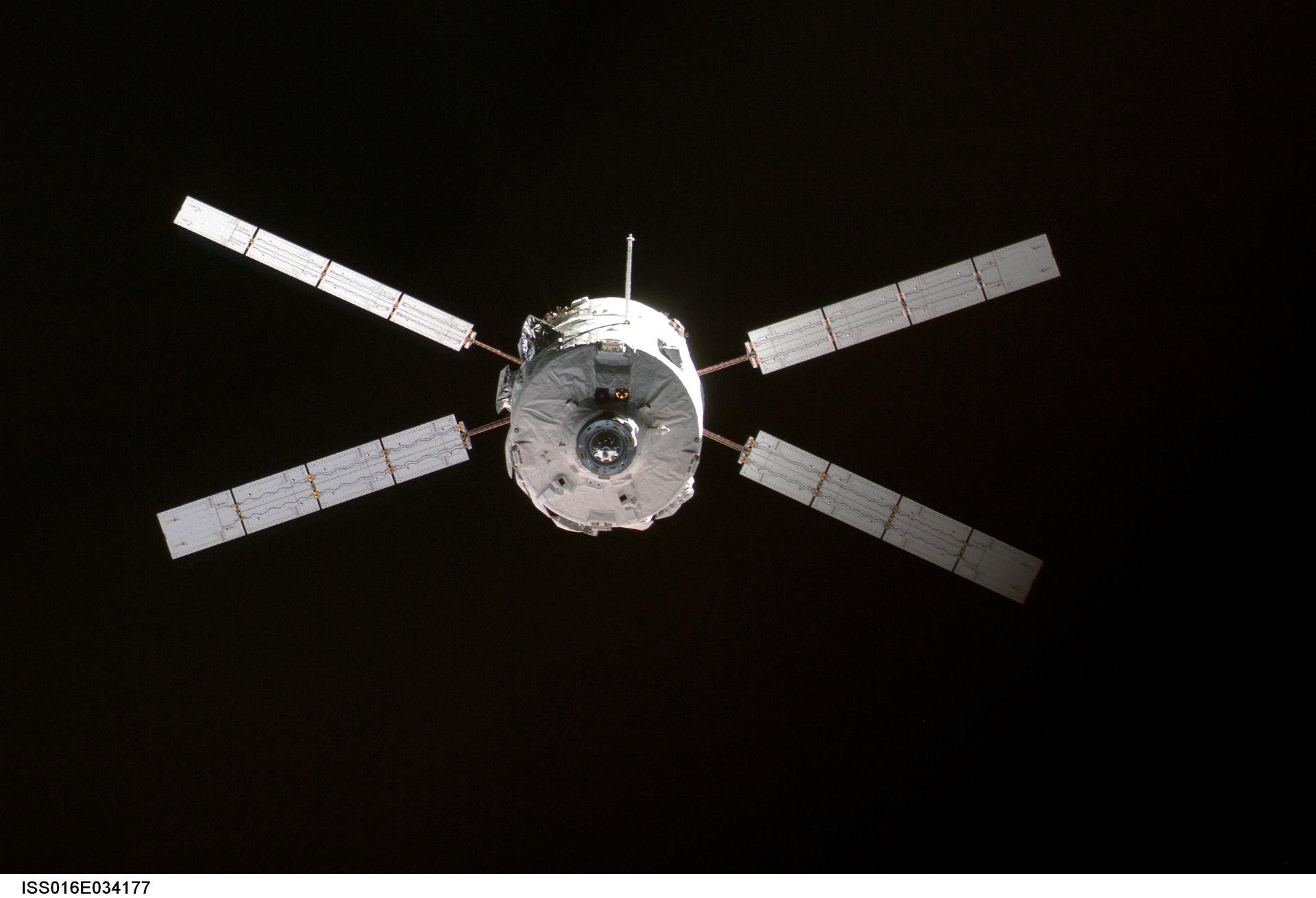 ISS016-E-034177 (31 March 2008) --- Backdropped by the blackness of space, the Jules Verne Automated Transfer Vehicle (ATV) approaches the International Space Station on Monday, March 31, 2008, for its "Demo Day 2" practice maneuvers. It moved to within 36 feet of the Zvezda Service Module in a rehearsal for docking on Thursday.