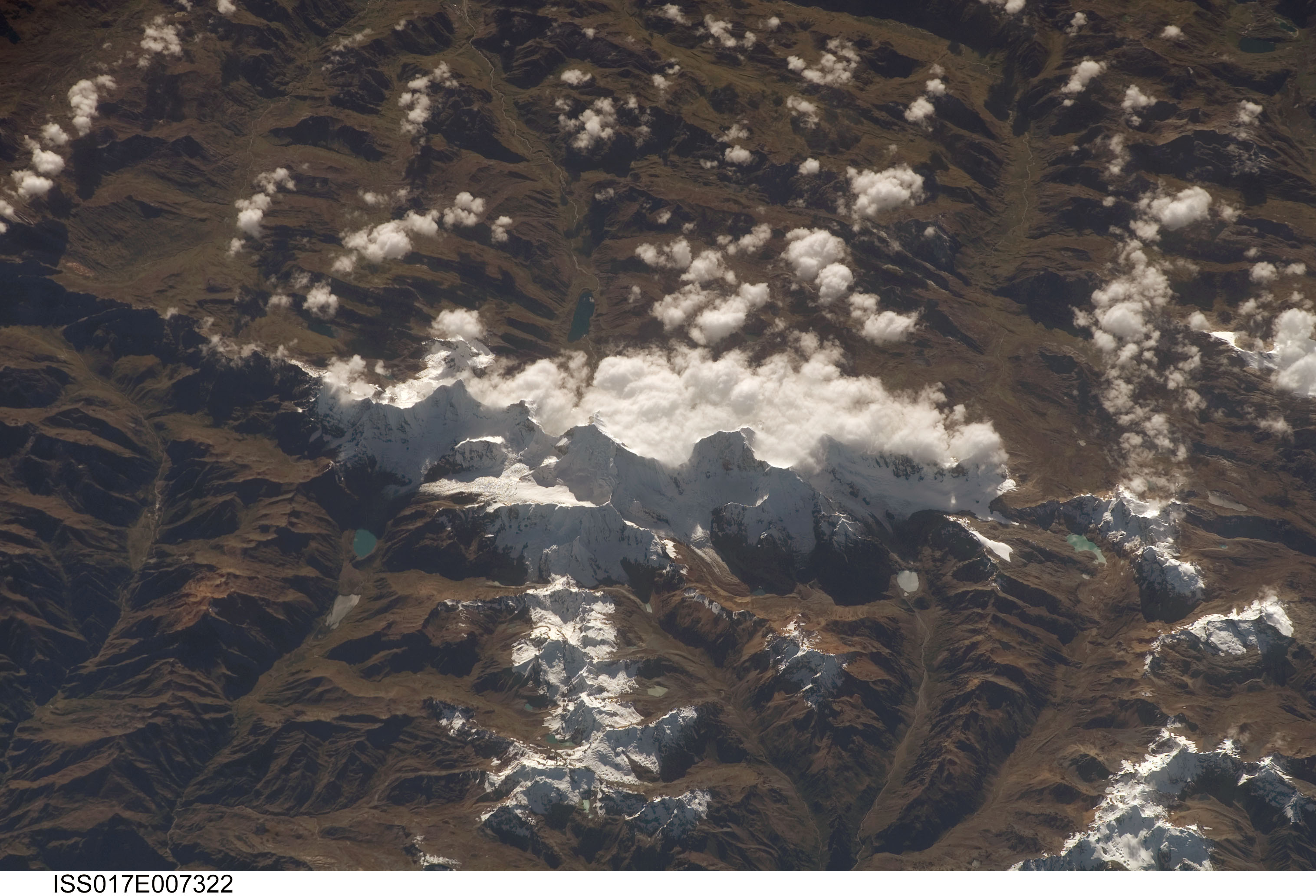 ISS017-E-007322 (17 May 2008) --- Cordillera Huayhuash in the Peruvian Andes is featured in this image photographed by an Expedition 17 crewmember on the International Space Station. This view was taken looking east as the station was flying approximately 100 kilometers off the Peruvian coast and shows Cordillera Huayhuash (pronounced Why-wash). Here clouds are banked up on the east side, snow covers all higher slopes and mountain peaks, and glaciers occupy lower slopes. This prominent but short mountain range (25 kilometers in length) boasts twenty peaks of remarkable steepness and ridge sharpness. Although only 100 kilometers from the coastline, six of the peaks reach above 6,000 meters (more than 19,500 feet), the highest of which is Nevado Yerupaja, Peru's second highest peak, variously estimated as 6,617 and 6,635 meters high. Generally considered the most spectacular peak in South America, Yerupaja is so steep that it has seldom been climbed. The best climbing approach is from the southwest, the face seen in this view. Yerupaja is locally known as El Carnicero (The Butcher) because of its blade-like ridges, features typical of mountains that have been heavily eroded by glacial ice. Other features created by the erosive effect of flowing ice are small glacial lakes, which often vary in color due to different amounts of fine mud being fed into them by meltwater from under the glaciers. According to scientists, during the ice ages the glaciers advanced many kilometers outward from the cordillera, occupying all the surrounding valley floors (all of which lie above 3,000 meters) producing the characteristic U-shaped valleys.