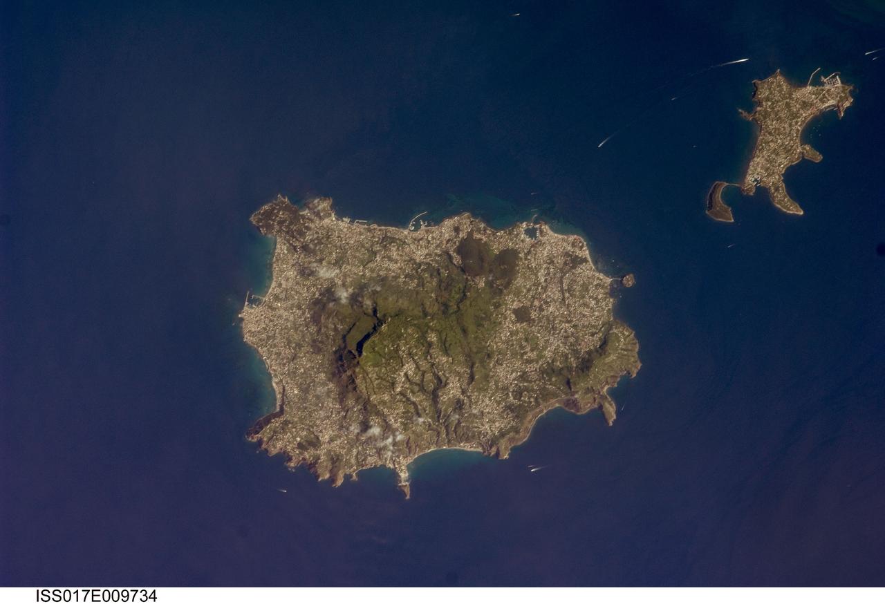 ISS017-E-009734 (20 June 2008) --- Island of Ischia, Italy is featured in this image photographed by an Expedition 17 crewmember on the International Space Station. The island of Ischia is located approximately 30 kilometers to the southwest of Naples, in the western Bay of Naples (part of the Tyrrenhian Sea). While the island's rocks are volcanic in origin, much of the island's geology and current appearance is characterized by uplifted -- horst -- and downdropped -- graben -- fault structures. For example, the highest point on the island of Ischia is Monte Epomeo (789 meters). The mountain is not a volcanic cone, but rather is composed of erupted materials uplifted by faulting. The green slopes of Monte Epomeo are enclosed by urban development (light grey speckled areas) that rings the island. According to scientists, the last volcanic activity on Ischia took place in 1302. The neighboring island of Procida (top right) was formed from the same magma sources as Ischia, and scientists believe it likely shared the same volcanic "plumbing system". Today, the island of Ischia is a popular tourist destination due to its hot springs, hot mud baths, and the hiking opportunities afforded by Monte Epomeo. Several boat wakes are visible around both islands in this view.