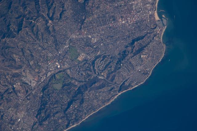 ISS018-E-011096 (6 Dec. 2008) --- Santa Barbara, CA metropolitan area, also known as the ?American Riviera?, is featured in this image photographed by an Expedition 18 crewmember on the International Space Station. The geographic setting of the city - between the Santa Barbara Channel to the south and the steep Santa Ynez Mountains to the north. The city was officially founded as a Spanish mission in 1786, and was incorporated into the United States from Mexico in 1848 following the Mexican-American War. The dramatic landscape of the city is the result of tectonic forces ? the Santa Barbara Channel is part of the boundary between the Pacific oceanic and North American continental crustal plates. Movement along the San Andreas Fault ? the actual zone of contact between the two plates ? over geologic time both raised the Santa Ynez range and lowered the seafloor, forming the deep Santa Barbara Channel. The city has experienced two earthquakes, one in 1812 and another in 1925 that caused significant damage. The urban street grid is defined by white and red rooftops at top center; to the southeast lie beaches and the boat slips of a large marina (top right). Two large golf courses, characterized by expanses of green grass, are visible at center. Low east-west trending hills that parallel the coastline are almost completely covered by residential and commercial development, lending a speckled appearance to the hillsides. Immediately offshore, giant kelp beds are the focus of the Santa Barbara Coastal Long Term Ecological Research site, part of the National Science Foundation?s Long Term Ecological Research Network.