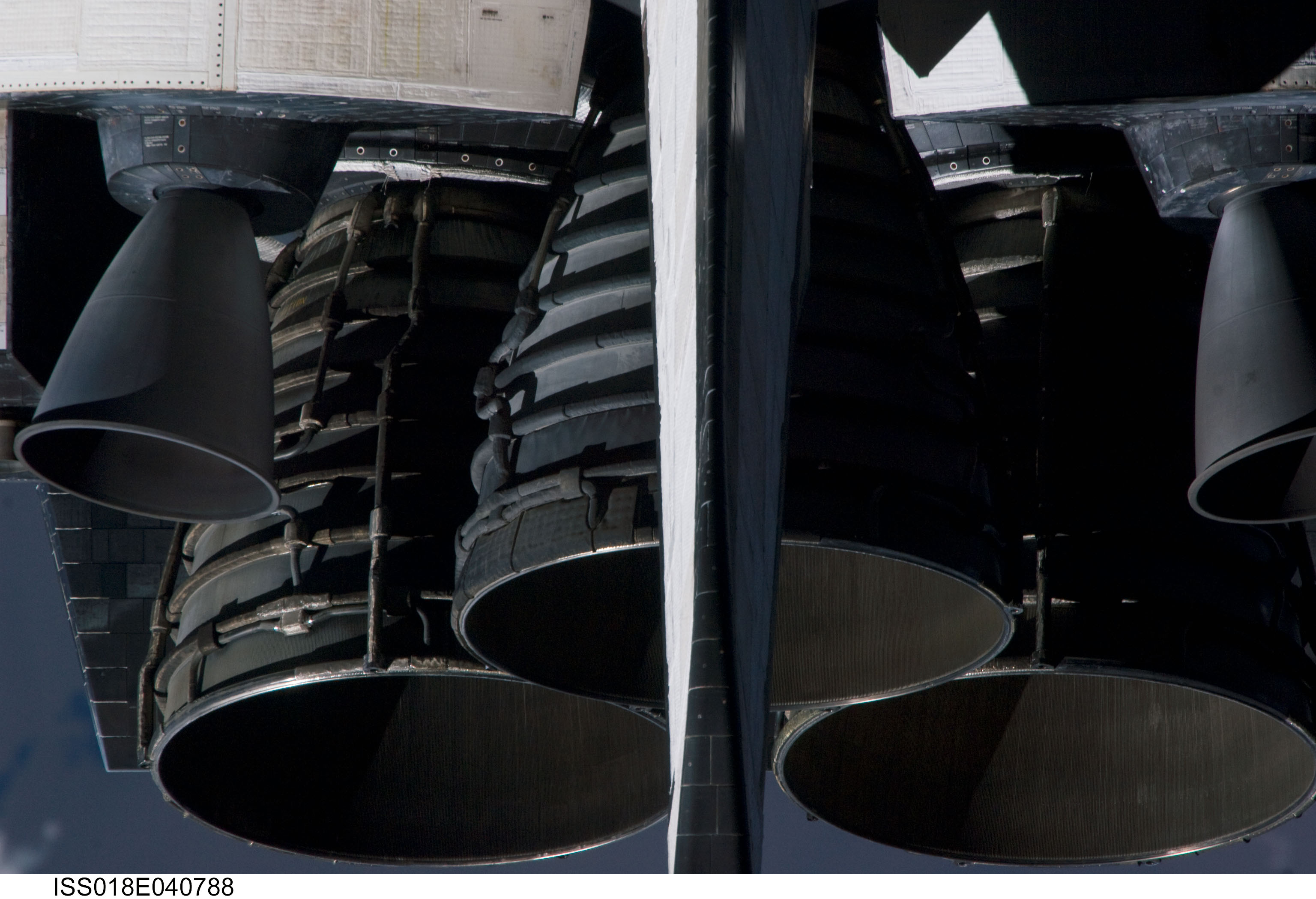 ISS018-E-040788 (17 March 2009) --- A close-up view of Space Shuttle Discovery?s main engines was provided by Expedition 18 crewmembers on the International Space Station. Before docking with the station, astronaut Lee Archambault, STS-119 commander, flew the shuttle through a Rendezvous Pitch Maneuver or basically a backflip to allow the space station crew a good view of Discovery's heat shield. Using digital still cameras equipped with both 400 and 800 millimeter lenses, the ISS crewmembers took a number of photos of the shuttle's thermal protection system and sent them down to teams on the ground for analysis. A 800 millimeter lens was used for this image.
