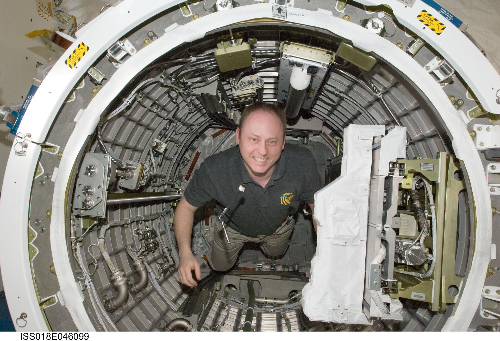 ISS018-E-046099 (5 April 2009) --- Astronaut Michael Fincke, Expedition 18 commander, works inside the Kibo laboratory airlock of the International Space Station.