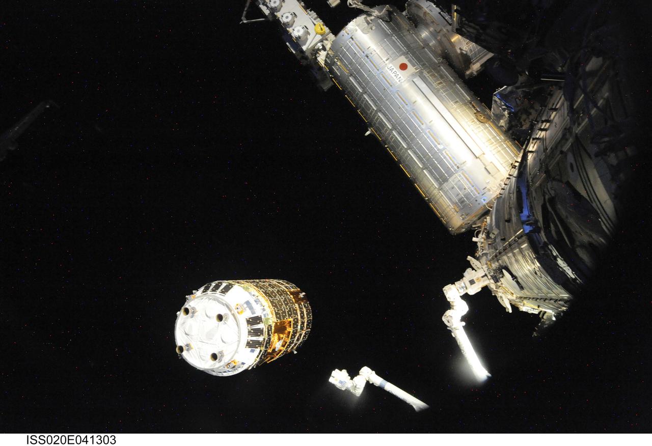 iss020e041303 (Sept. 17, 2009) --- The Canadarm2 robotic arm reaches out to grapple the Japanese H-II Transfer Vehicle (HTV) before installing the HTV to the Harmony module's Earth-facing port on the International Space Station. This was the Canadarm2's first free-flying capture of a spacecraft and the first flight of the HTV cargo craft from JAXA (Japan Aerospace Exploration Agency).