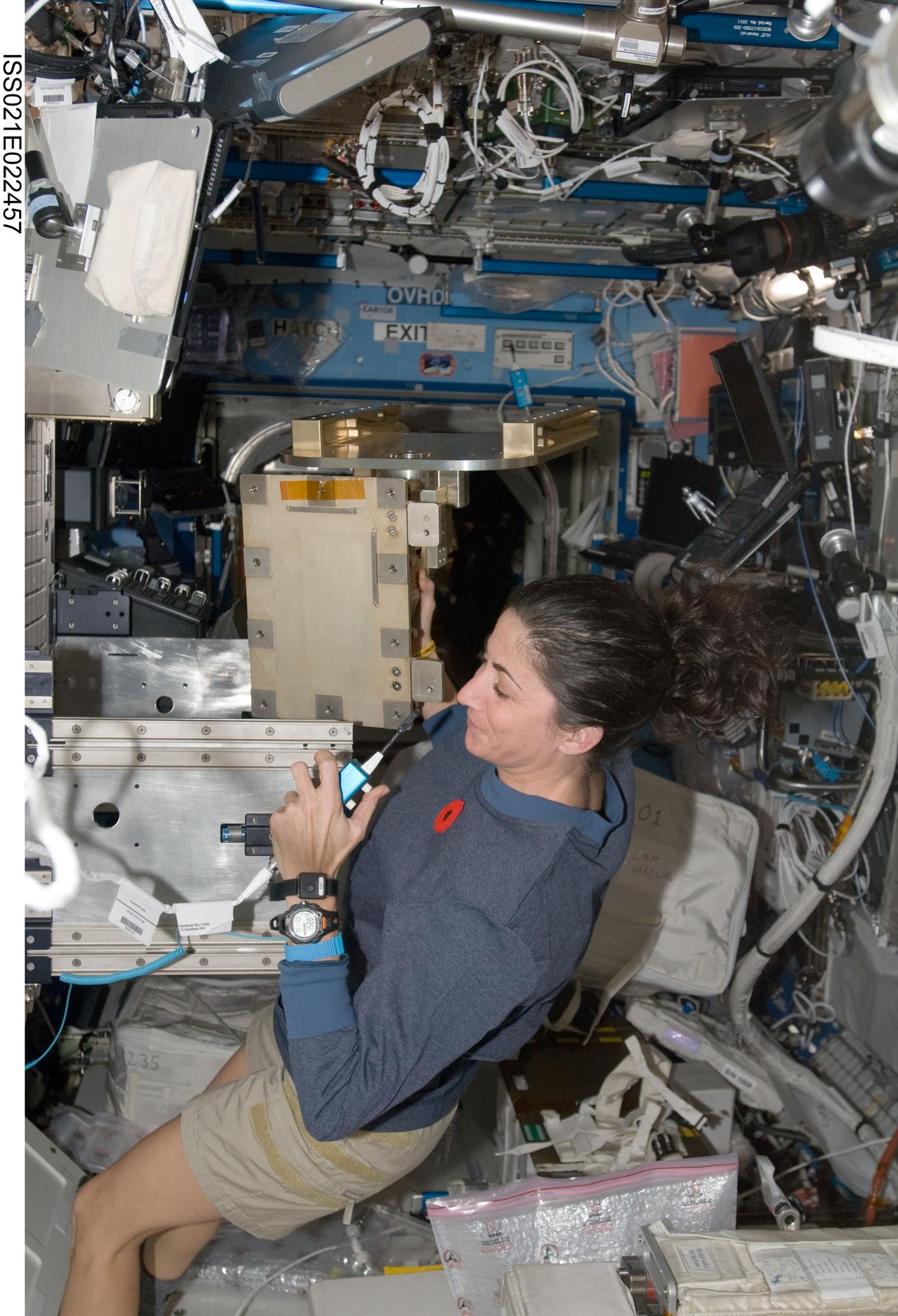 ISS021-E-022457 (9 Nov. 2009) --- NASA astronaut Nicole Stott, Expedition 21 flight engineer, uses a communication system while installing the Light Microscopy Module (LMM) Spindle Bracket Assembly in the Fluids Integrated Rack (FIR) in the Destiny laboratory of the International Space Station. Canadian Space Agency astronaut Robert Thirsk (out of frame) assisted Stott.