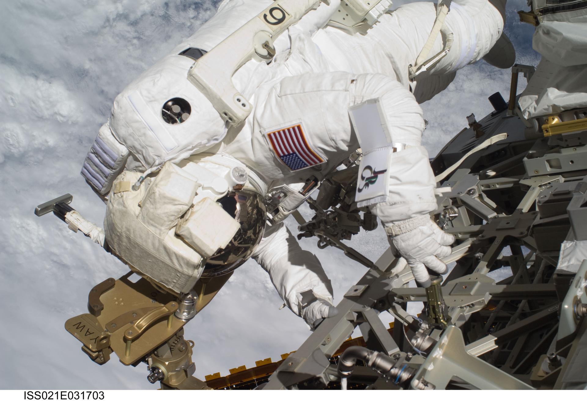 ISS021-E-031703 (23 Nov. 2009) --- Astronaut Robert L. Satcher Jr., STS-129 mission specialist, participates in the mission's third and final session of extravehicular activity (EVA) as construction and maintenance continue on the International Space Station. During the five-hour, 42-minute spacewalk, Satcher and astronaut Randy Bresnik (out of frame), mission specialist, removed a pair of micrometeoroid and orbital debris shields from the Quest airlock and strapped them to the External Stowage Platform #2, then moved an articulating foot restraint to the airlock, and released a bolt on a starboard truss ammonia tank assembly (ATA) in preparation for an STS-131 spacewalk that will replace the ATA.