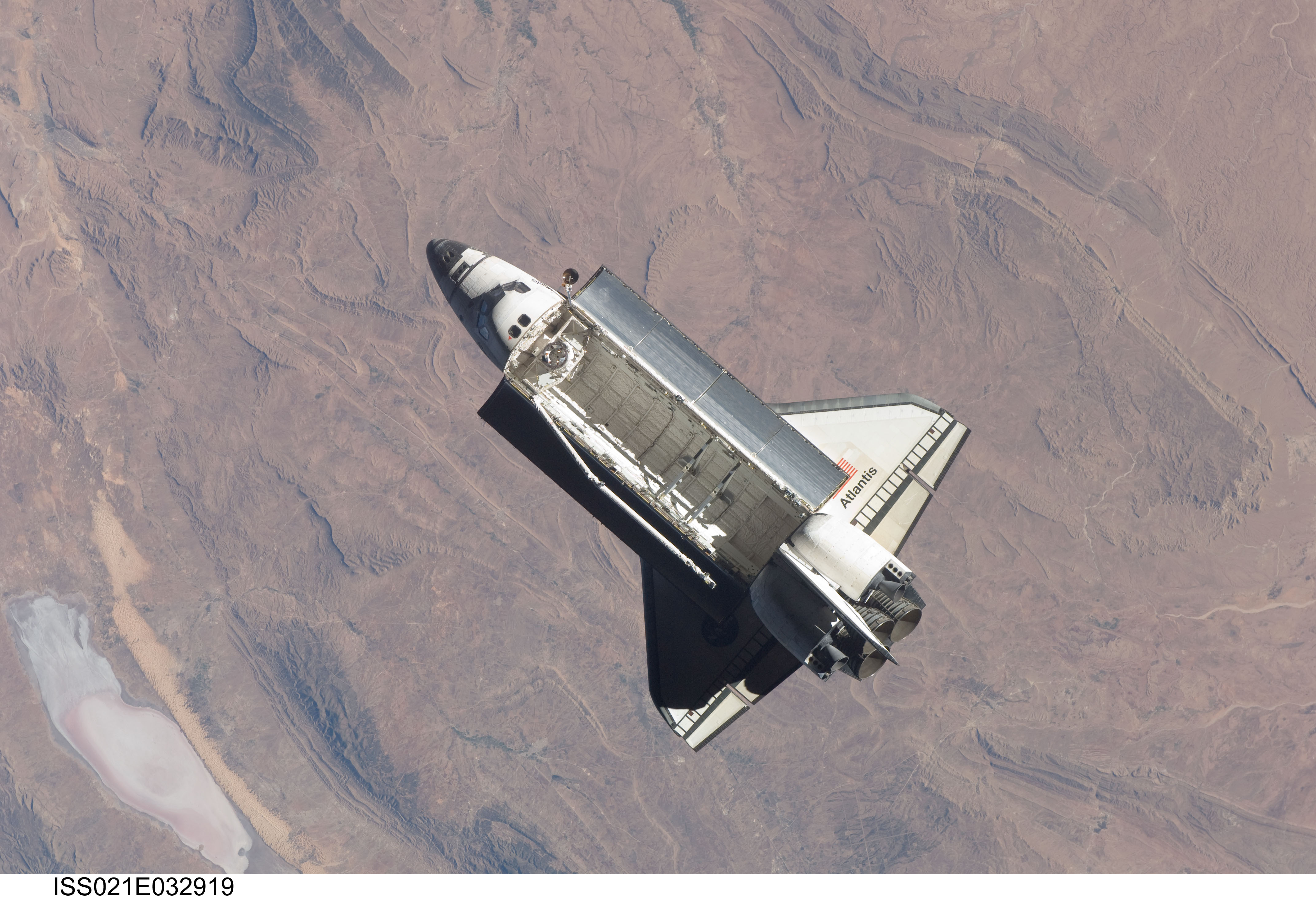 ISS021-E-032919 (25 Nov. 2009) --- Backdropped by rugged Earth terrain, space shuttle Atlantis (STS-129) is featured in this image photographed by an Expedition 21 crew member on the International Space Station soon after the shuttle and station began their post-undocking relative separation. Undocking of the two spacecraft occurred at 3:53 a.m. (CST) on Nov. 25, 2009.