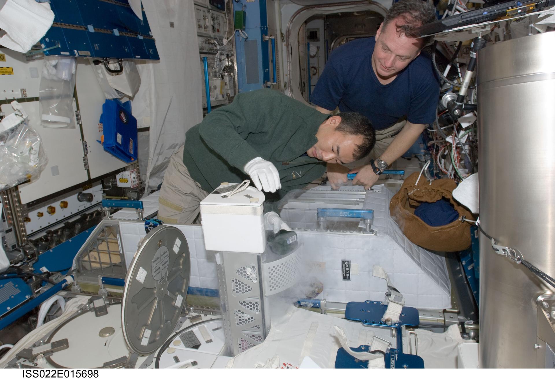 ISS022-E-015698 (28 Dec. 2009) --- Japan Aerospace Exploration Agency astronaut Soichi Noguchi (left) and NASA astronaut T.J. Creamer, both Expedition 22 flight engineers, service the Minus Eighty Laboratory Freezer for ISS (MELFI-1) in the Kibo laboratory of the International Space Station.