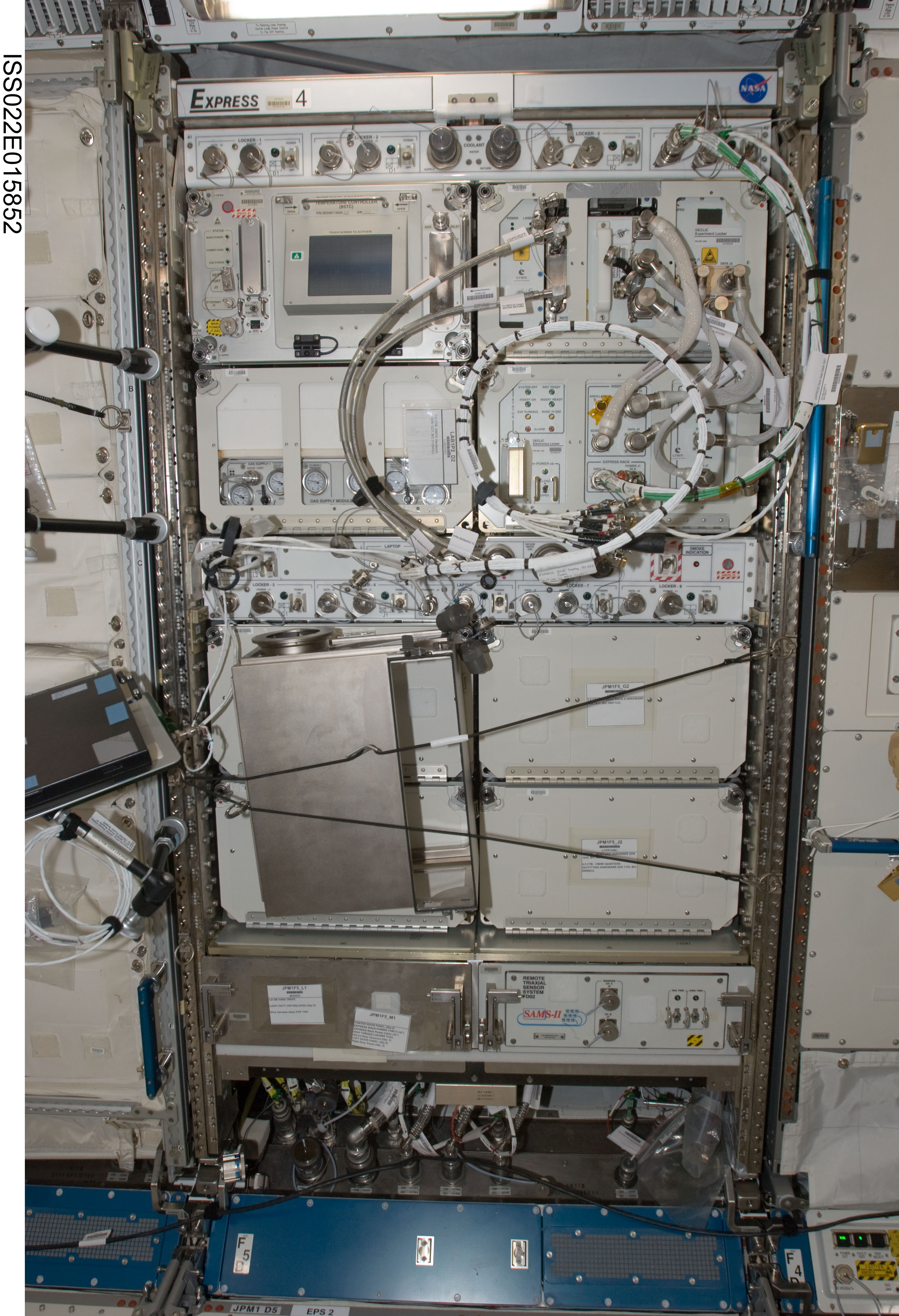 iss022e015852 (12/30/2009) --- The image shows a front view of EXpedite the PRocessing of Experiments to Space Station EXPRESS Rack 4 (Rack 4,JPM/1F5) in the Japanese Experiment Module (JEM) Japanese Pressurized Module (JPM). Equipment visible in the EXPRESS Rack includes the Biotechnology Specimen Temperature Controller (BSTC) and the Gas Supply Module (GSM) support hardware for the CBOSS (Cellular Biotechnology Operations Support Systems) investigations, and the Device for the Study of Critical Liquids and Crystallization (DECLIC). Also visible is the Space Acceleration Measurement System (SAMS) II.