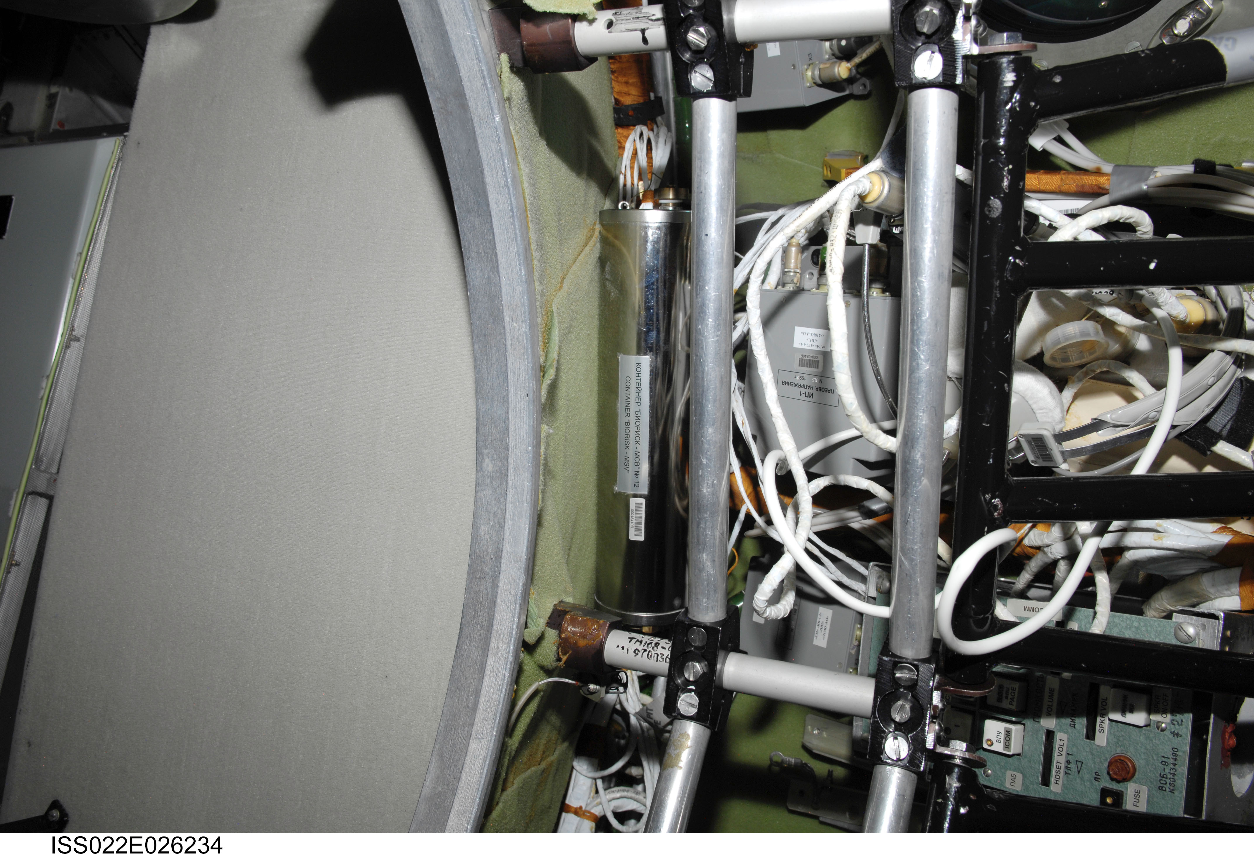 iss022e026234 (1/20/2010) --- A view of Container Biorisk MSV No. 12, in the Service Module (SM) aboard the International Space Station (ISS). The Influence of Factors of the Space Environment on the Condition of the System of Microorganisms-Hosts Relating to the Problem of Environmental Safety of Flight Techniques and Planetary Quarantine (Biorisk) investigation aims to obtain new data on physical and genetic changes in bacteria and fungi typically found on spacecraft equipment, and also in various biological test objects (higher plant seeds, dormant forms of lower crustaceans) under exposure in the interior ISS compartments and on the exterior ISS surfaces.