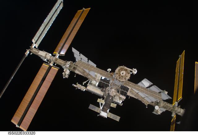 ISS022-E-033320 (21 Jan. 2010) --- The International Space Station is featured in this image photographed by a crew member on the Soyuz TMA-16 spacecraft during the relocation of the Soyuz from the Zvezda Service Module’s aft port to the Poisk module. Russian cosmonaut Maxim Suraev, Soyuz commander and Expedition 22 flight engineer; along with NASA astronaut Jeffrey Williams, Expedition 22 commander, undocked the Soyuz spacecraft at 4:03 a.m. (CST) and docked it to Poisk at 4:24 a.m. on Jan. 21, 2010.