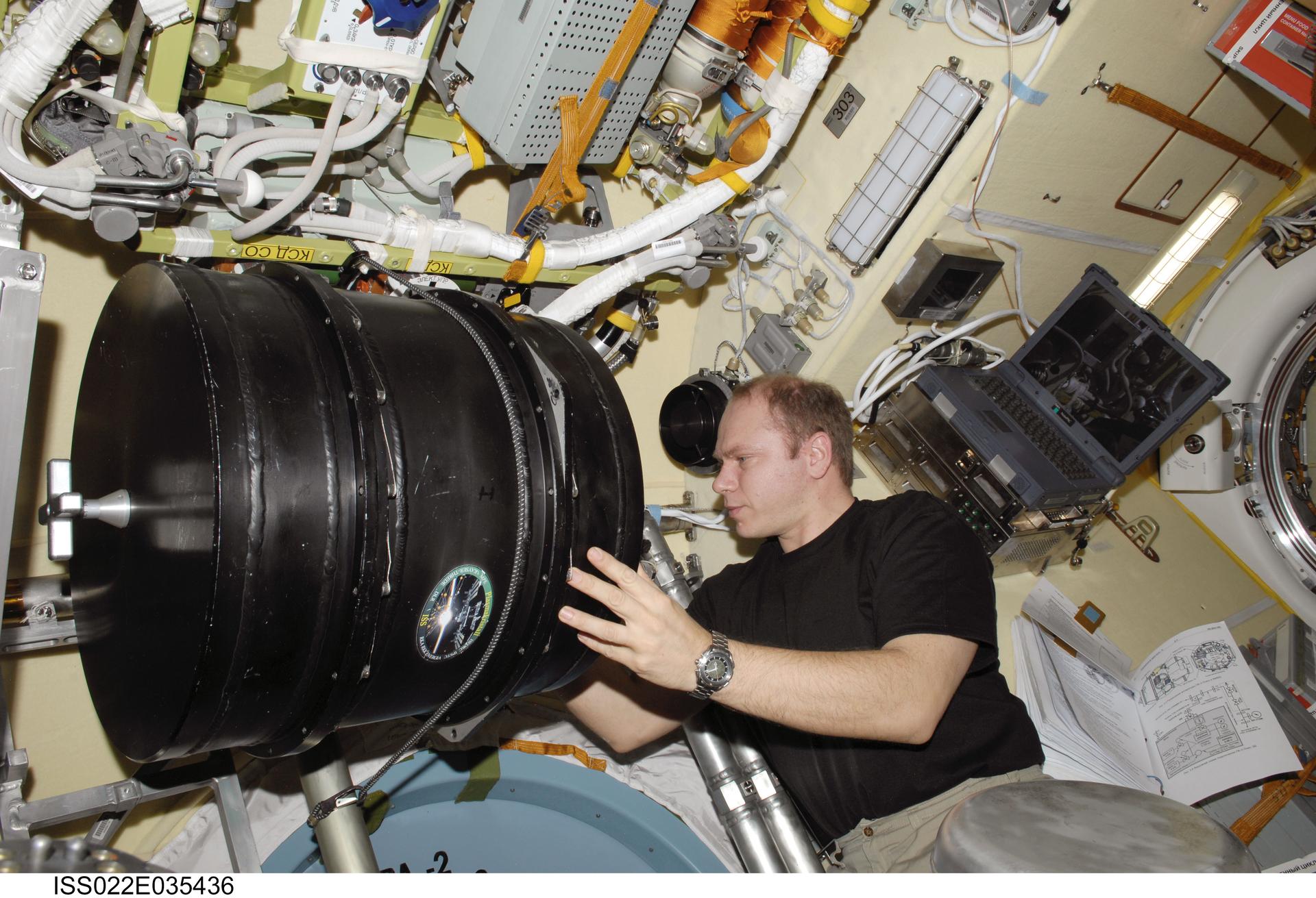 ISS022-E-035436 (25 Jan. 2010) --- Russian cosmonaut Oleg Kotov, Expedition 22 flight engineer, works with the Plasma Crystal-3 experiment in the Zvezda Service Module of the International Space Station.