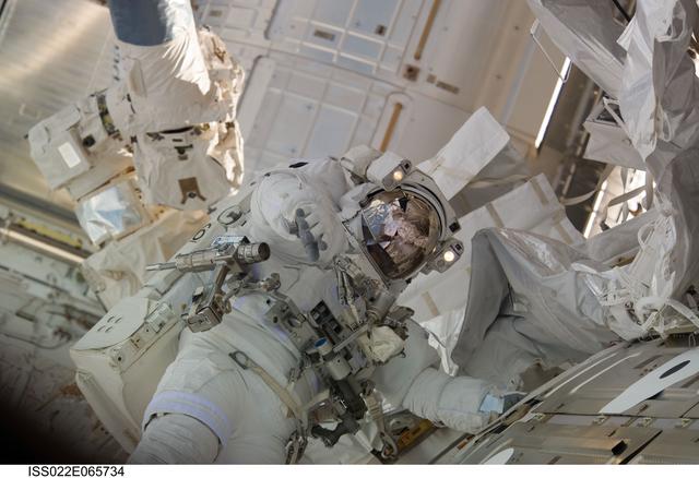 ISS022-E-065734 (14 Feb. 2010) --- NASA astronaut Nicholas Patrick, STS-130 mission specialist, participates in the mission?s second session of extravehicular activity (EVA) as construction and maintenance continue on the International Space Station. During the five-hour, 54-minute spacewalk, Patrick and Robert Behnken (out of frame), mission specialist, connected two ammonia coolant loops, installed thermal covers around the ammonia hoses, outfitted the Earth-facing port on the Tranquility node for the relocation of its Cupola, and installed handrails and a vent valve on the new module.