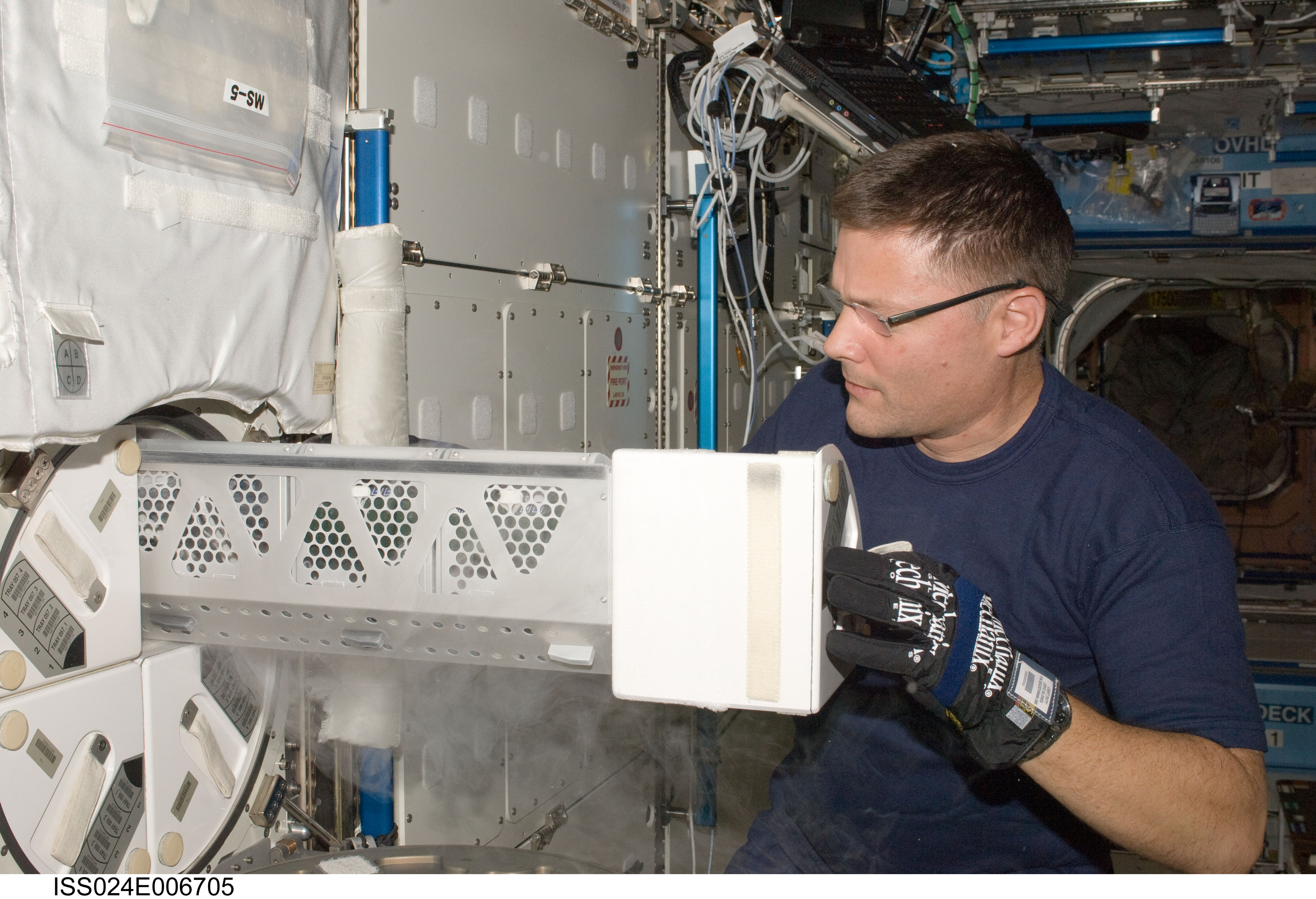 ISS024-E-006705 (28 June 2010) --- After inserting biological samples, NASA astronaut Doug Wheelock, Expedition 24 flight engineer, replaces a dewar tray in the Minus Eighty Laboratory Freezer for ISS-2 (MELFI-2) in the Destiny laboratory of the International Space Station.