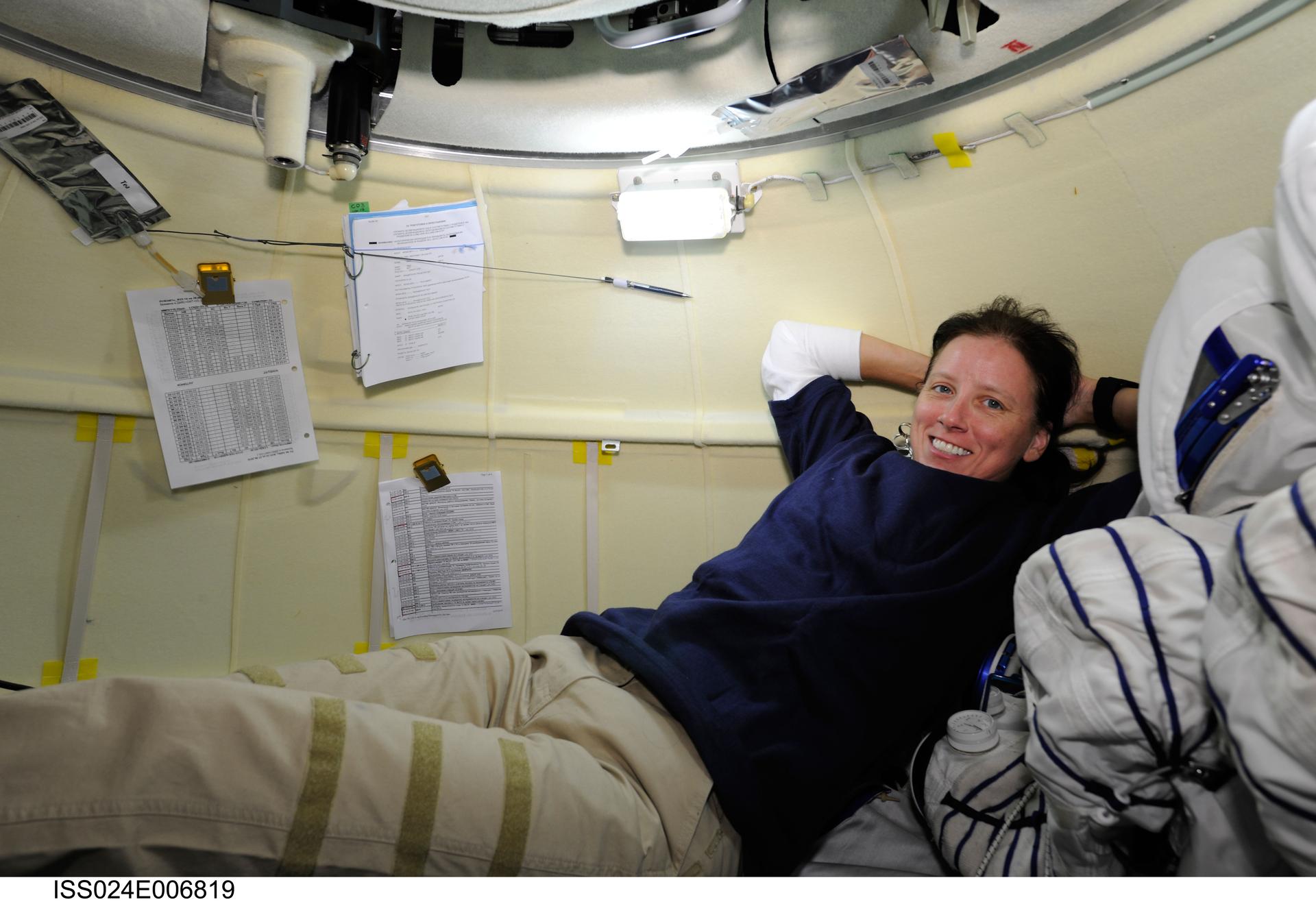 ISS024-E-006819 (28 June 2010) --- NASA astronaut Shannon Walker, Expedition 24 flight engineer, is pictured in the orbital module of the Soyuz TMA-19 spacecraft while docked to the Zvezda Service Module’s aft port of the International Space Station. Later Walker, along with NASA astronaut Doug Wheelock and Russian cosmonaut Fyodor Yurchikhin donned their Russian Sokol launch and entry suits and relocated the Soyuz from the Zvezda aft end to the Rassvet Mini-Research Module 1 (MRM1).