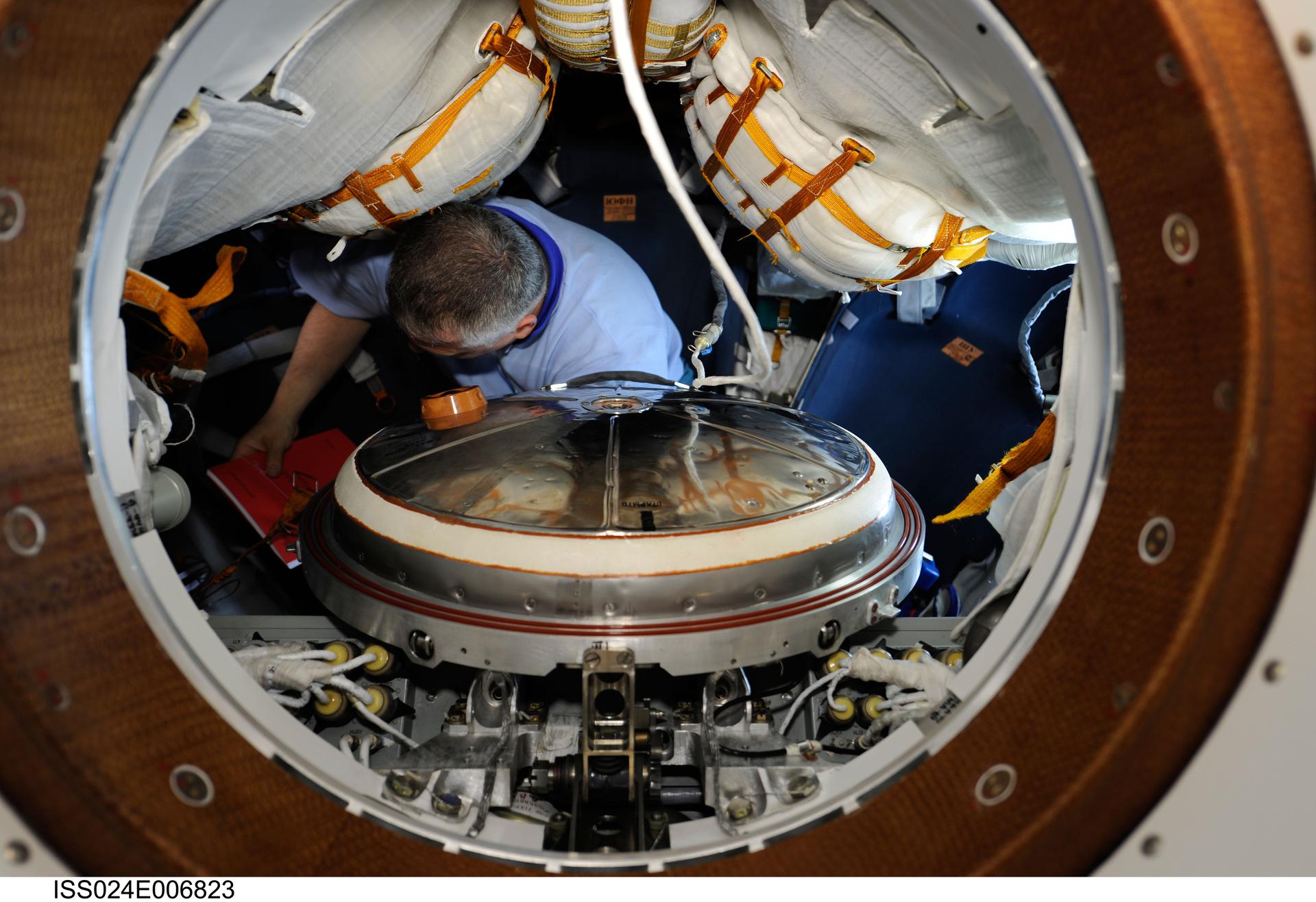 ISS024-E-006823 (28 June 2010) --- Russian cosmonaut Fyodor Yurchikhin, Expedition 24 flight engineer, works in Soyuz TMA-19 spacecraft while docked to the Zvezda Service Module’s aft port of the International Space Station. Later Yurchikhin, along with NASA astronauts Doug Wheelock and Shannon Walker donned their Russian Sokol launch and entry suits and relocated the Soyuz from the Zvezda aft end to the Rassvet Mini-Research Module 1 (MRM1).