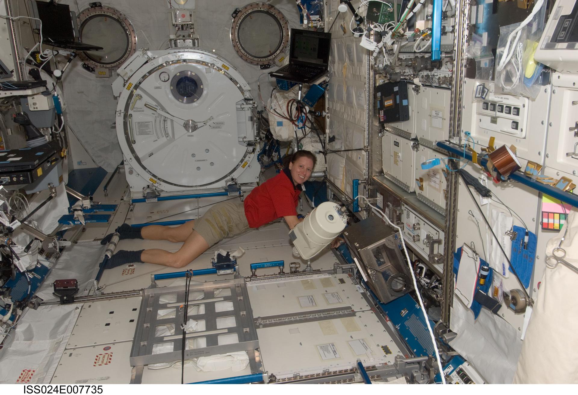 ISS024-E-007735 (10 July 2010) --- NASA astronaut Shannon Walker, Expedition 24 flight engineer, uses a vacuum cleaner during housekeeping operations in the Kibo laboratory of the International Space Station.