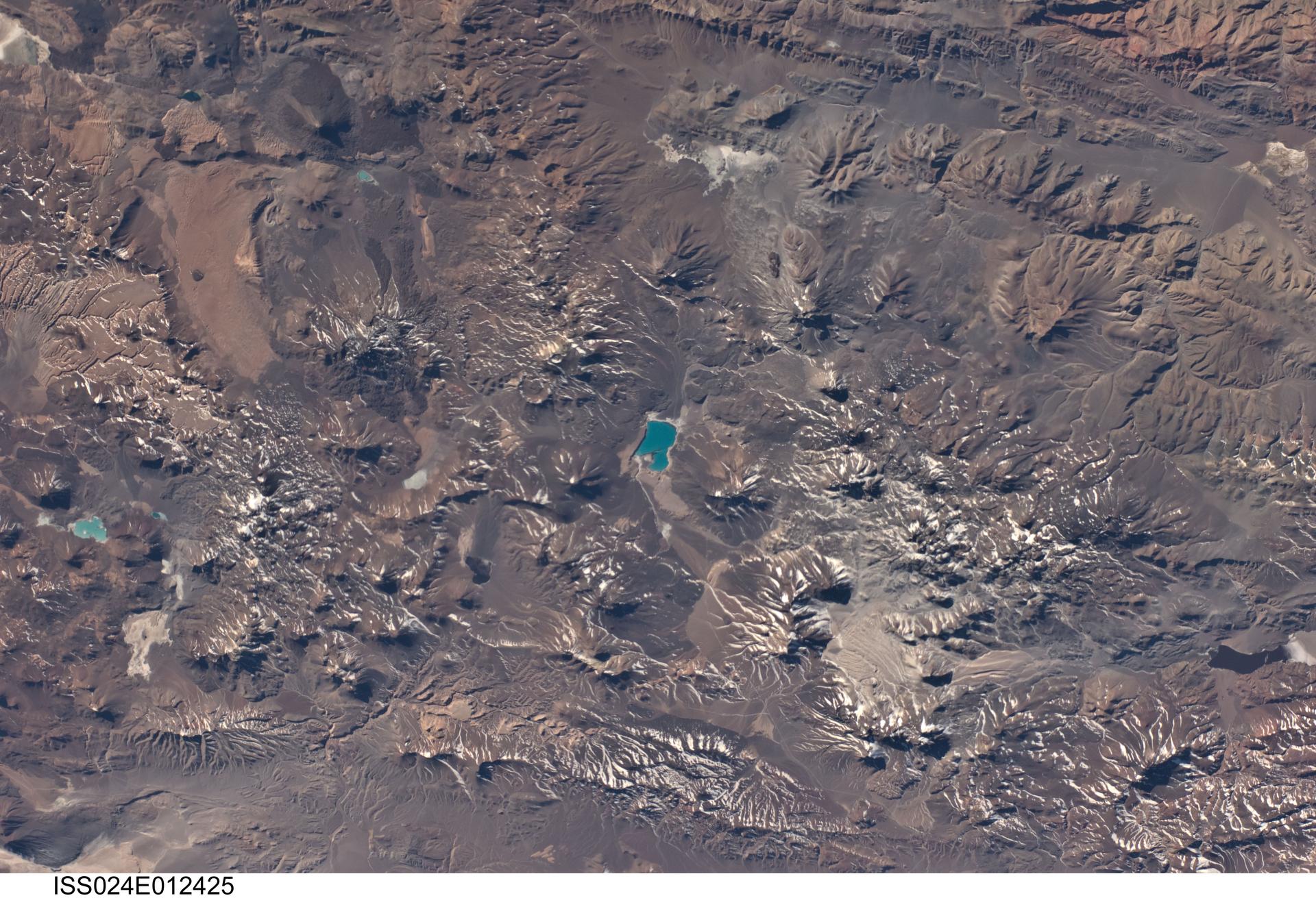 ISS024-E-012425 (22 Aug. 2010) --- This photograph, featuring a landscape in the central Andes mountains near the Chile/Argentina border dominated by numerous volcanoes and associated landforms, was photographed by an Expedition 24 crew member on the International Space Station. Layers of older sedimentary rocks are visible to the southeast (upper right). Many of the volcanic cones show grooves eroded by water to form gullies. Such erosion has occurred since the host volcano was built up, indicating that most volcanoes in this view have been inactive for centuries or millennia. A few volcanoes exhibit much less erosion, and even show tongues of recent, dark lava flows (top left). According to scientists, two of these volcanoes, Cerro el Condor and Peinado have likely erupted within approximately the last 12,000 years (the Holocene Epoch). Also visible in the image is the world’s highest active volcano, Nevado Ojos del Salado, with a summit at 6,887 meters above sea level. The most recent confirmed eruption of this volcano has been dated to 700 (approximately 300 years), but minor eruptive activity may have occurred as recently as 1993. Stratovolcanoes such as Cerro el Condor, Peinado, and Nevado Ojos del Salado are formed partly by buildup of lava flows and partly by buildup of explosively vented material dropping back down onto the surface. One type of material associated with explosive eruptions is welded tuff, which is formed by molten and fragmented rock that accumulates on the ground and later solidifies. A large tuff sheet is visible at top left. Formed very rapidly, these sheets have been termed “instant landscapes.” So active has the Andean volcanic system been that the origin of many of the tuffs in the Andes cannot be pinpointed since source vents have been overprinted by subsequent volcanic events. The volcanic landscape also shows that the erosive work of rivers—and glaciers repeatedly in the recent past—is slower than the opposite processes of the upward building of the volcanoes. The bright blue, nearly 7-kilometer-long lake near the center of the image is known as Laguna Verde. This and other less obvious lakes indicate that water (snowmelt or direct precipitation) is unable to reach the sea, but is rather impounded in the depressions between the volcanic edifices.