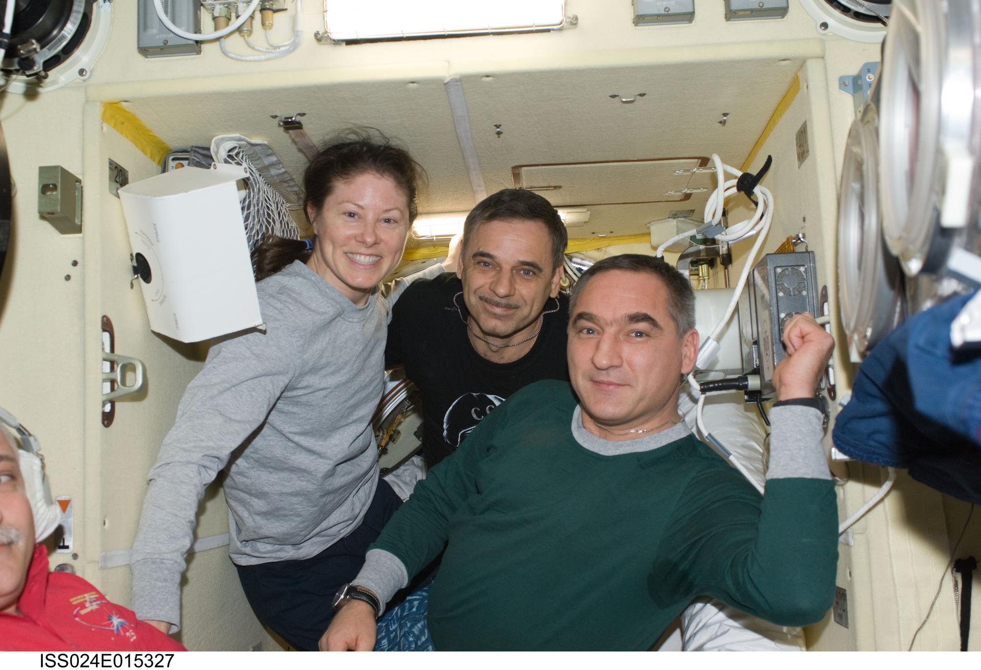 ISS024-E-015327 (24 Sept. 2010) --- Russian cosmonaut Alexander Skvortsov (right), Expedition 24 commander; NASA astronaut Tracy Caldwell Dyson and Russian cosmonaut Mikhail Kornienko, both flight engineers, pose for a photo during final preparations for their departure in the Soyuz TMA-18 docked to the Poisk Mini-Research Module 2 (MRM2) of the International Space Station. Originally scheduled for Sept. 23, the Soyuz undocked a day later due to a Poisk-side hatch sensor problem, which prevented hooks on the Poisk side of the docking interface from opening. The Soyuz undocked at 10:02 p.m. (EDT) on Sept. 24, 2010.