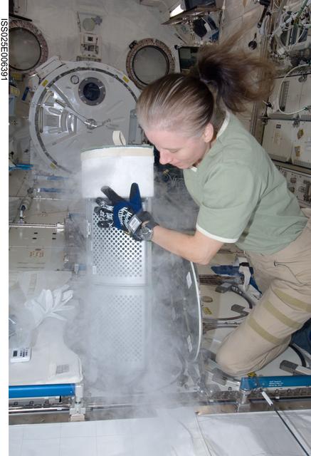 ISS025-E-006391 (8 Oct. 2010) --- NASA astronaut Shannon Walker, Expedition 25 flight engineer, services the Minus Eighty Laboratory Freezer for ISS (MELFI-1) in the Kibo laboratory of the International Space Station.