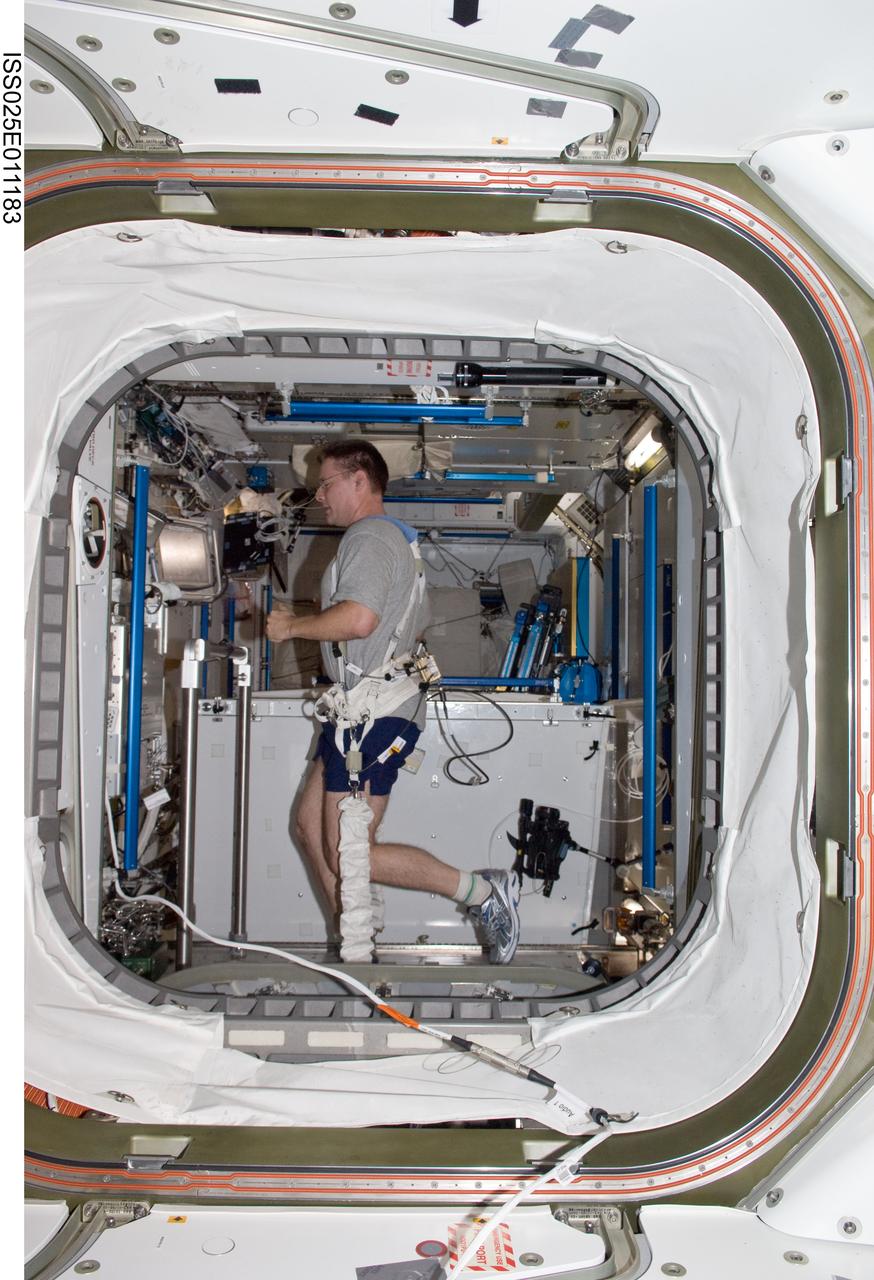 ISS025-E-011183 (3 Nov. 2010) --- NASA astronaut Doug Wheelock, Expedition 25 commander, equipped with a bungee harness, exercises on the Combined Operational Load Bearing External Resistance Treadmill (COLBERT) in the Tranquility node of the International Space Station.