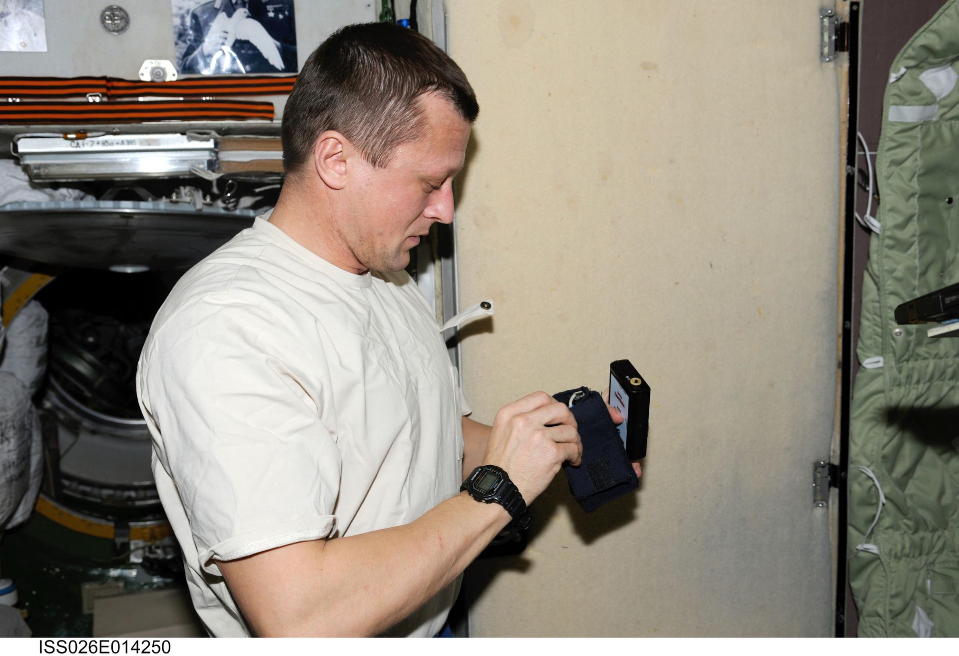 ISS026-E-014250 (3 Jan. 2011) --- Russian cosmonaut Dmitry Kondratyev, Expedition 26 flight engineer, sets up the Russian MBI-12 payload for a Sonokard experiment session in the Zvezda Service Module of the International Space Station. Kondratyev used a sports shirt from the Sonokard kit with a special device in the pocket for testing a new method for acquiring physiological data without using direct contact on the skin. Measurements are recorded on a data card for return to Earth.