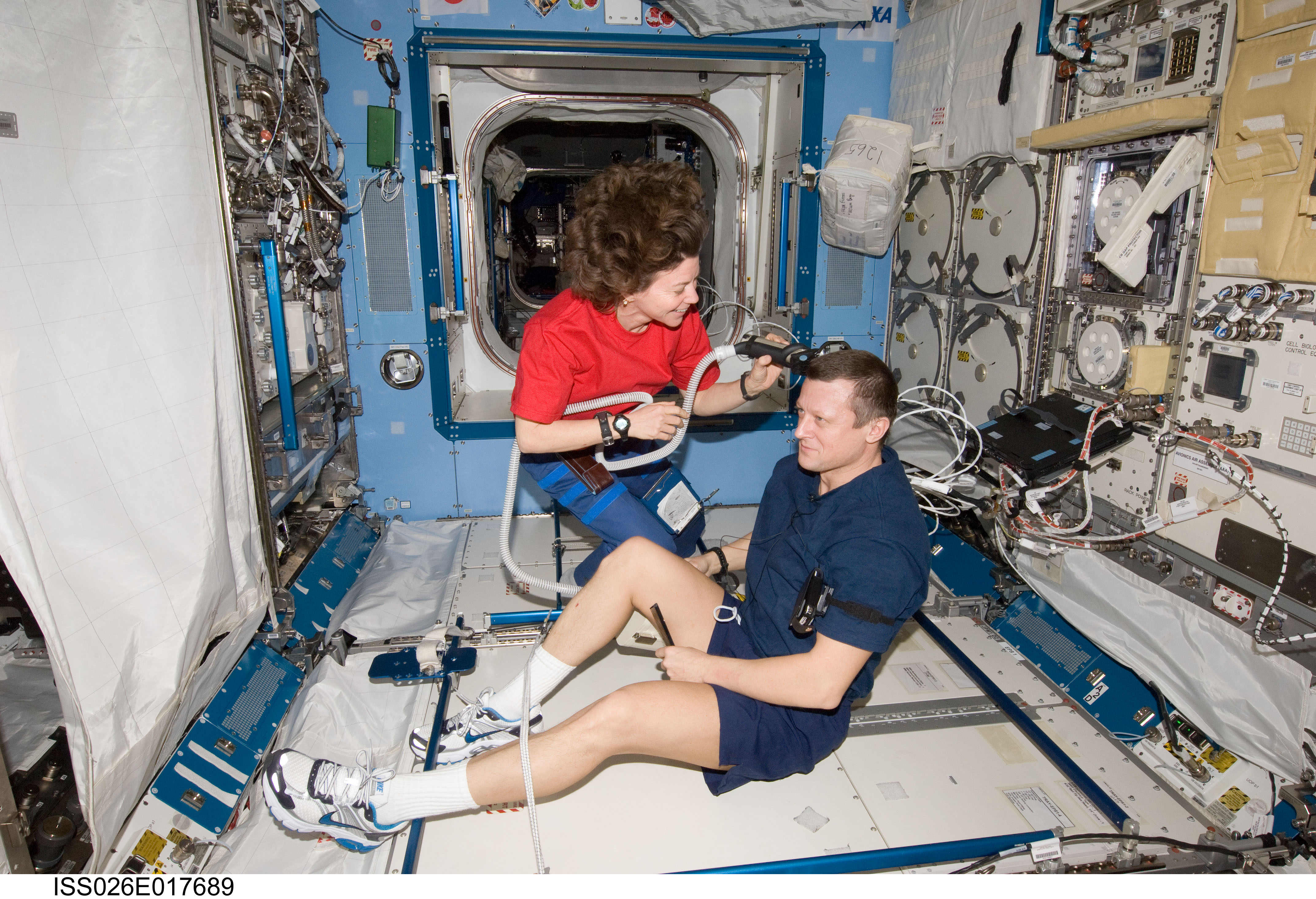 ISS026-E-017689 (15 Jan. 2011) --- NASA astronaut Catherine (Cady) Coleman assists cosmonaut Dmitry Kondratyev of Russia's Federal Space Agency (Roscosmos) with a haircut in the Kibo laboratory on the International Space Station. The two Expedition 26 flight engineers used a vacuum cleaner (partially out of frame) to remove free-floating hair particles from the air.