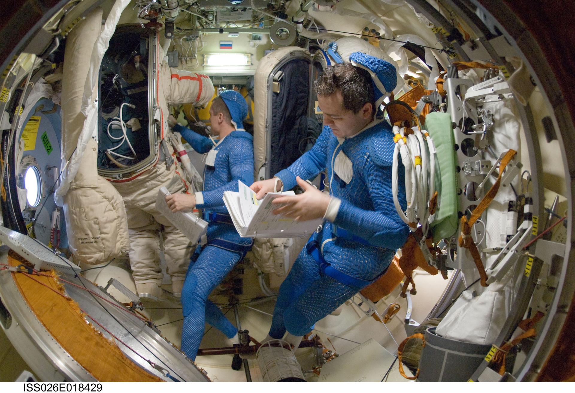 ISS026-E-018429 (18 Jan. 2011) --- Attired in blue thermal undergarments that complement the Russian Orlan spacesuit, Russian cosmonauts Dmitry Kondratyev (left) and Oleg Skripochka, both Expedition 26 flight engineers, prepare to don and check out their Orlan spacesuits in preparation for a spacewalk scheduled for Jan. 21, 2011. During the spacewalk Kondratyev and Skripochka will complete the installation of a new high-speed data transmission system, remove an old plasma pulse experiment, install a camera for the new Rassvet docking module and retrieve a materials exposure package.