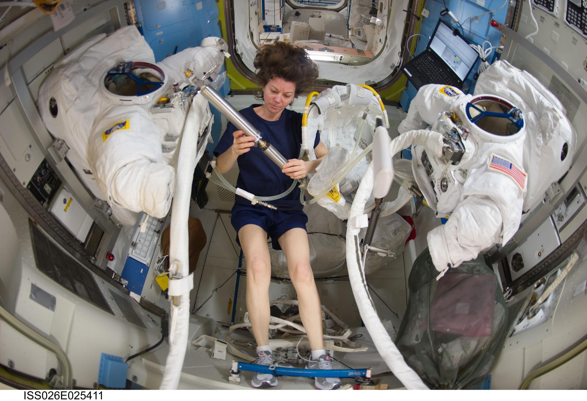 ISS026-E-025411 (9 Feb. 2011) --- NASA astronaut Catherine (Cady) Coleman, Expedition 26 flight engineer, works with Extravehicular Mobility Unit (EMU) spacesuit equipment in the Quest airlock of the International Space Station.